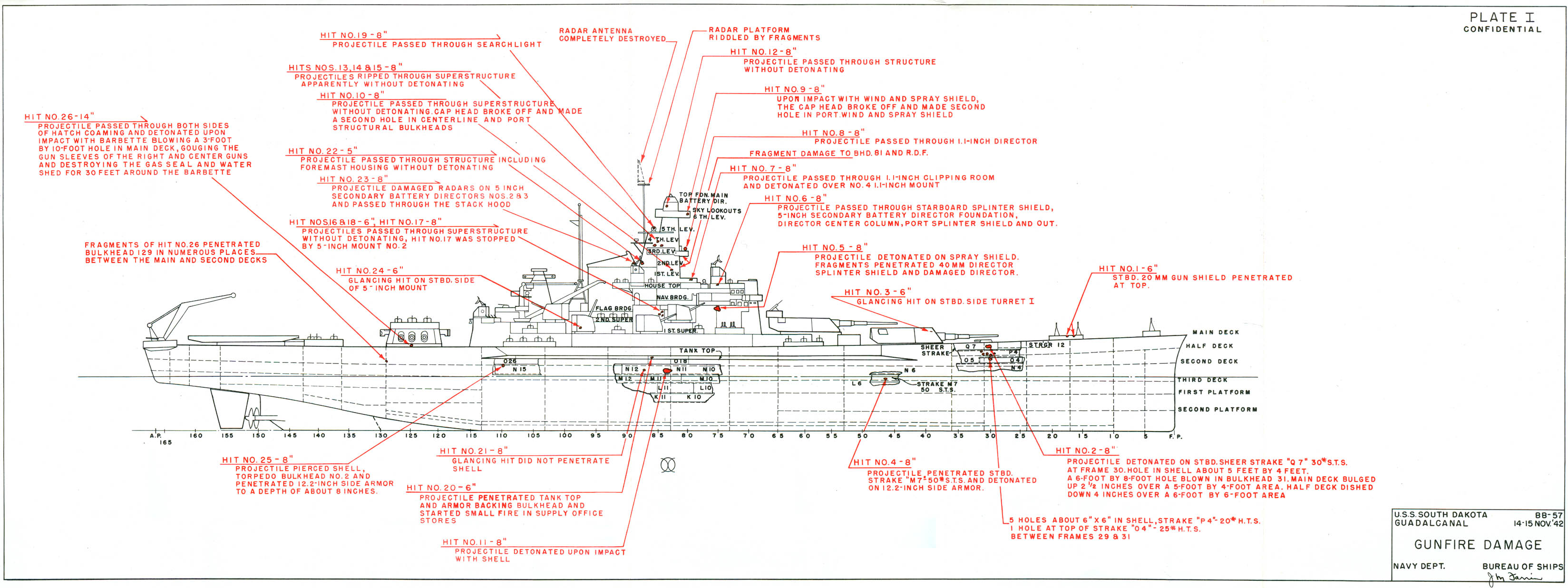 | CONFIDENTIAL U.S.S. SOUTH DAKOTA (BB57) Gunfire Damage Battle of Guadalcanal 14-15 November 1942