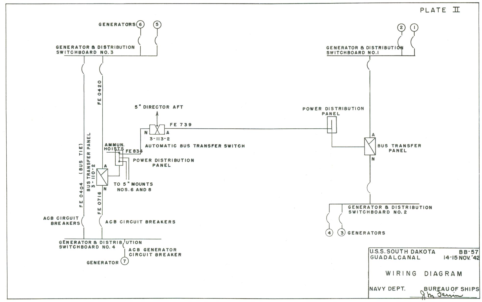 | CONFIDENTIAL equipment on I.C. and F.C. circuits in the superstructure. The short-circuits produced an overload such that the circuit breaker on the normal feeder to the I.C. switchboard tripped on main generator and distribution switchboard No. 1. The I.C. switchboard was equipped with automatic bus transfer to shift the power supply to the emergency Diesel genorator switchboard No. 1 in case of interruption of normal power from the main board. As the capacity of the Diesel generator was considerably smaller than the connected load on the I.C. switchboard, the F.C. and I.C. bus was energized through a 1000 ampere circuit breaker which was designed to automatically open before the automatic bus transfer operated. Thus, only the load on the I.C. restricted bus, which was well within the capacity of the emergency generator, would remain on the board. The circuit breaker opened properly. But after the automatic bus transfer operated, the fuzes protecting the emergency supply "blew." Apparently several of the circuits connected to the I.C. restricted bus were still short-circuited. Defective circuits were isolated and power restored on all serviceable I.C. and F.C. circuits in approximately three minutes. 44. Ordinarily, matters which are not the result of damage by enemy action are not included in damage reports. In this case, however, the fact that electrical failure initiated by the shock of gunfire was a handicap to SOUTH DAKOTA while in action warrants some comment. As a result of this failure, numerous control shifts had to be made and it was reported that all power on the after part of the ship was lost for about a minute. This occurred before receiving the first hit. 45. At the time of the failure, normal power was being supplied to the after 5-inch director from generator and distribution switchboard No. 4 through a bus transfer panel, power distribution panel, and an automatic bus transfer switch (PLATE II). The automatic bus transfer switch received its alternate supply from generator and distribution switchboard No. 2 through a bus transfer panel and a power distribution panel. The AQB circuit breakers in the distrioution panels, which were in unattended locations, were "locked in" in accordance with outstanding instructions. 46. The shock produced by Turret III firing astern caused the contactor for the alternate power supply in the automatic bus transfer switch to close, thereby paralleling generator and distribution switchboards No. 4 and No. 2. As the two power sources were not in phase the resulting synchronizing current surge welded the contacts on the automatic bus transfer switch closed and the normal feeder cable to the after 5-inch director (FE834) ruptured and short-circuited between phases on the No. 4 generator and distribution switchboard side of the rupture. Because no mention was made of trouble on the alternate power supply to the director, it is inferred that the rupture of the normal feeder cleared the short-circuit on the alternate supply which then continued to supply the director. As the AQB circuit breaker in the power distribution panel was "locked in" the fault on generator and distribution switchboard No. 4 was cleared by the tripping of generator No. 7 ACB circuit breaker. It was not reported whether the feeder ACB circuit breaker tripped also but it was implied that it did. |