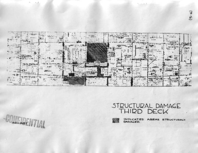 Enclosure "B" Main Deck Second Deck Third Deck Fourth Deck Boiler Room #4 Enclosure "C" Sketches showing Areas of Structural Damage. Flight Deck Gallery Deck Forecastle Deck Main Deck Second Deck Third Deck Fourth Deck Enclosure "D" Sketches showing Areas of Fires. Flight Deck Gallery Deck Forecastle Deck Main Deck Second Deck Third Deck |