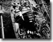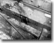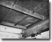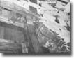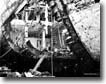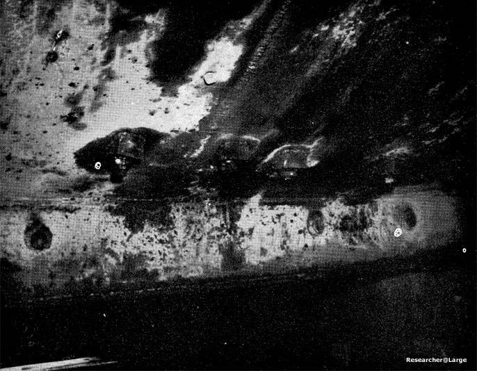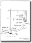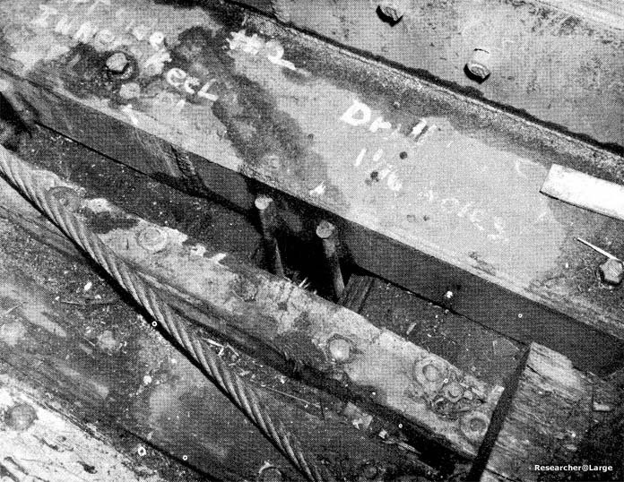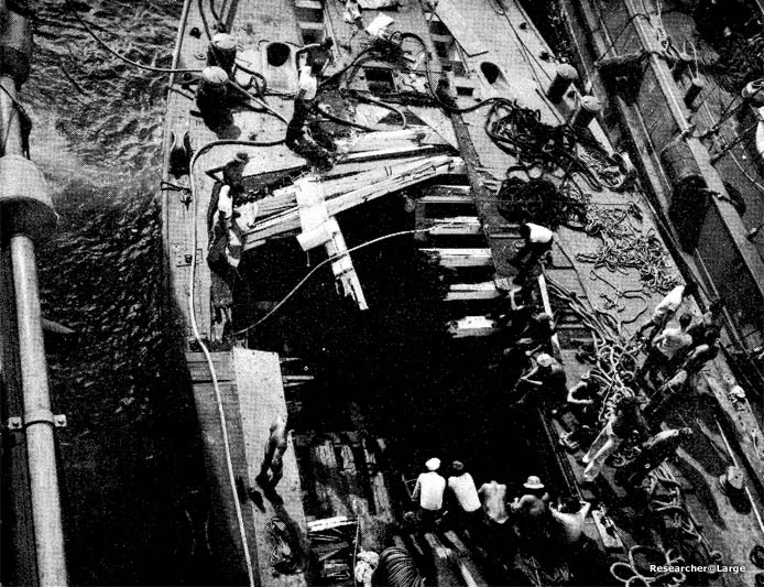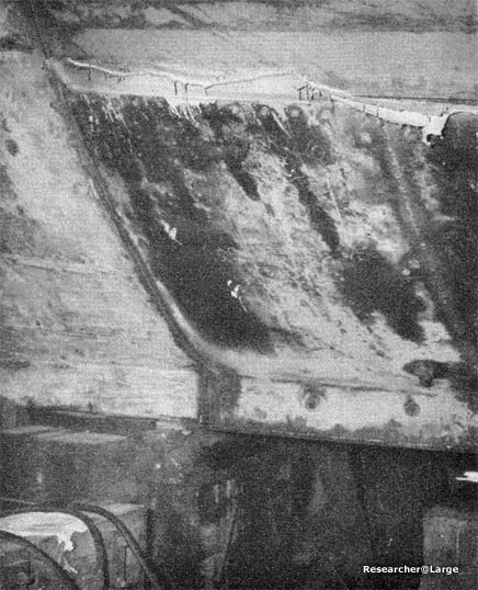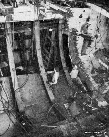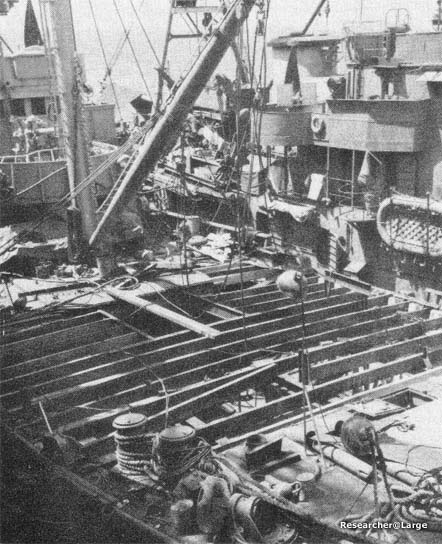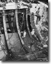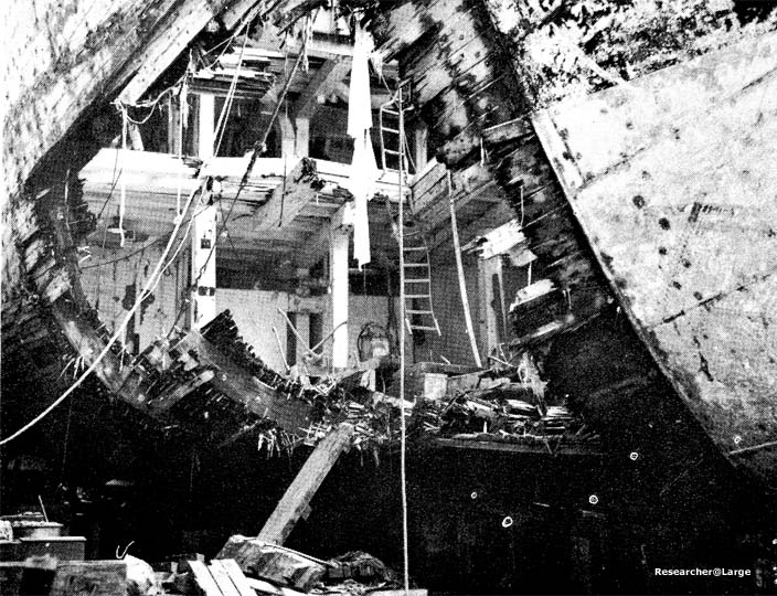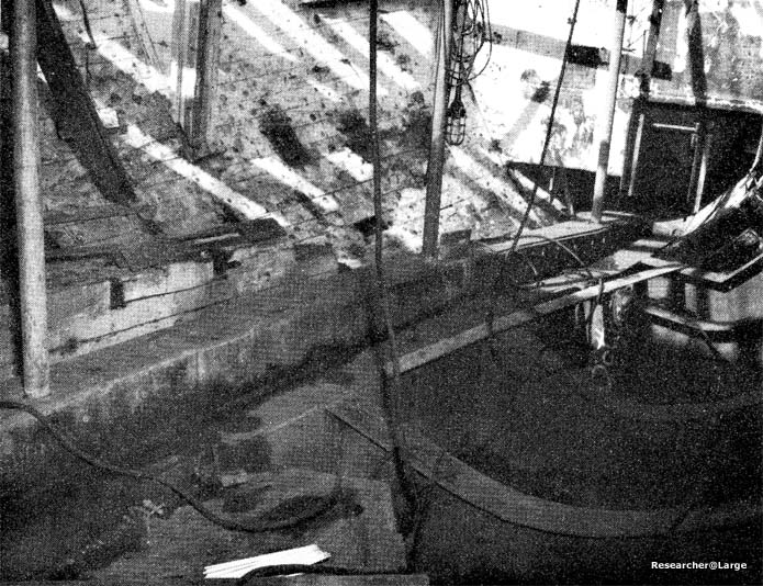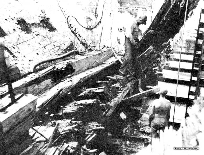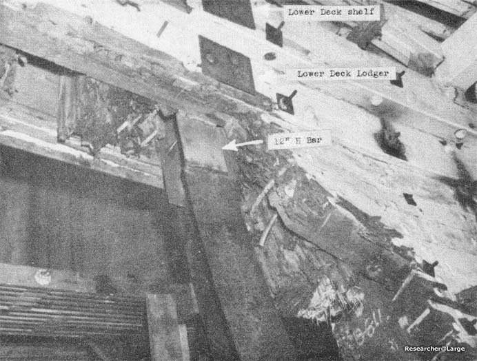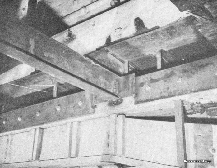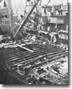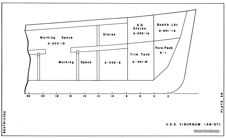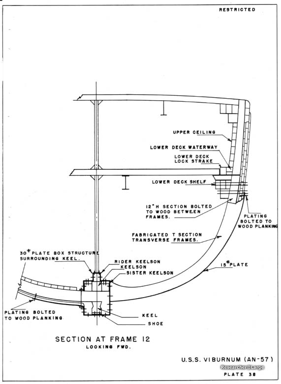 1. VIBURNUM, a wooden hull ship, struck a contact mine at frame 12 starboard. The explosion tore a hole in the shell between frames 6 and 17 starboard and from the keel to the second deck side longitudinal (Photo 82), tore a hole in the second deck and in the port side of the main deck (Photo 83). The keelson (Photo 84) and planking about 3 feet to port were shattered between frames 7 and 18. The bolts pulled loose in connections between the shell and all bulkheads forward of frame 30. All spaces forward of bulkhead 30 flooded to the waterline as the ship took on a draft of 21 feet forward; 10 feet aft. 2. The crew undertook salvage measures that succeeded in reducing the drafts to 17' 6" forward and 12' aft. In order to accomplish this, the horns were cut off and moved to the fantail, the anchor chains were moved aft, debris was removed from the damaged spaces forward, and A-1W and the space between bulkheads 27 and 30 were made tight so that the spaces could be pumped dry. This made it possible to drydock VIBURNUM in ARDL 32 (Plate 38). 3. After VIBURNUM was drydocked, debris and damaged planking was cleared away and repairs were undertaken. Since neither materials nor trained personnel required to effect wood repairs were available, it was necessary to use steel. The keel was encased in 3/4" steel plate, which was bolted to it and extended well beyond the ends of the damage in order to provide structural continuity. The box structure surrounded the keel completely on the starboard side (Photo 85), but terminated on top of the port bilge ceiling (Photo 86). Bolts through the shell plating were used in conjunction with bolts through the wood structure to attach the steel box (Photo 87). 4. Transverse framing in the damaged area was replaced by fabricated steel T sections (Plate 39). The lower end of these frames were welded to the box girder encasing the keel structure. Their upper ends were welded to 12" H sections that were inserted and bolted through the lower