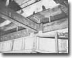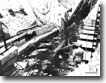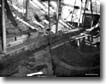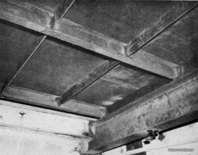 deck shelf and lodger between frame spaces (Photos 88 and 89). Shell plating was welded to the steel keel box girder and to the frames. It was welded to the bow sheathing at the forward end. Other boundaries overlapped and were bolted to undamaged wood structure. A canvas gasket impregnated with red lead was used to make connections between wood and steel hull structures watertight.(Photo 90). 5. The damaged portion of the lower deck was replaced by a steel deck. Deep I beams were used to replace the longitudinal 9" x 9" timber girders and served as intermediate supports for transverse channel sections which terminated in specially designed structure that landed on the lower deck shelf and was bolted to the lower deck lockstrake (Photos 91 and 92), The replacement of the main deck was similar to that,of the lower deck, with deep longitudinal I girders replacing the 9" x 9" longitudinal timbers. Transverse channels were landed on the main deck shelf and were given intermediate support by the longitudinals (Photo 93). Pipe stanchions were installed between the hold, lower and main decks to provide additional support. 6. Although these repairs were intended to enable VIBURNUM to proceed to a mainland yard, they proved so successful that the vessel continued to serve in the forward area for the duration of the war.