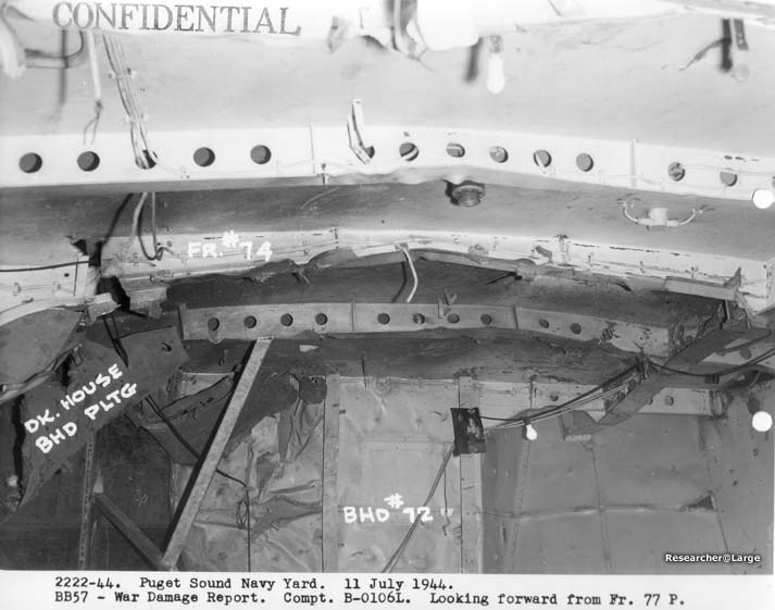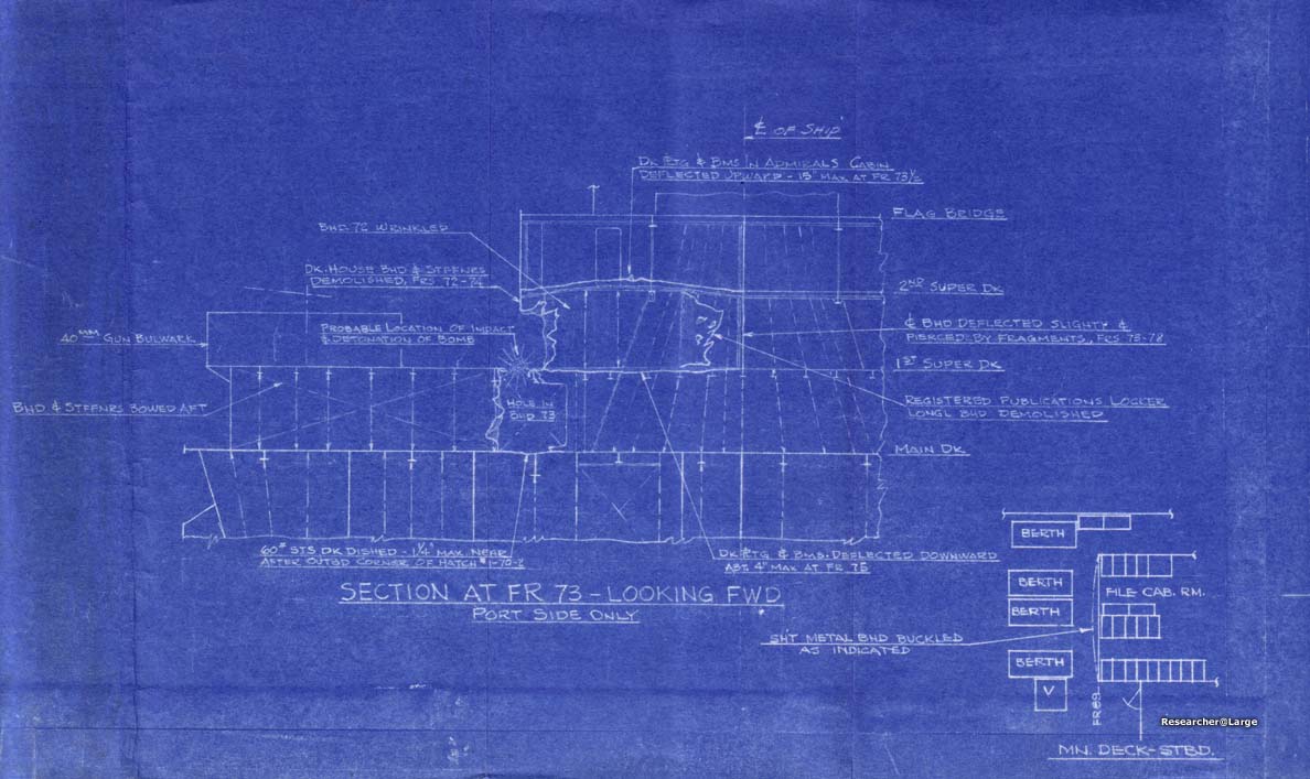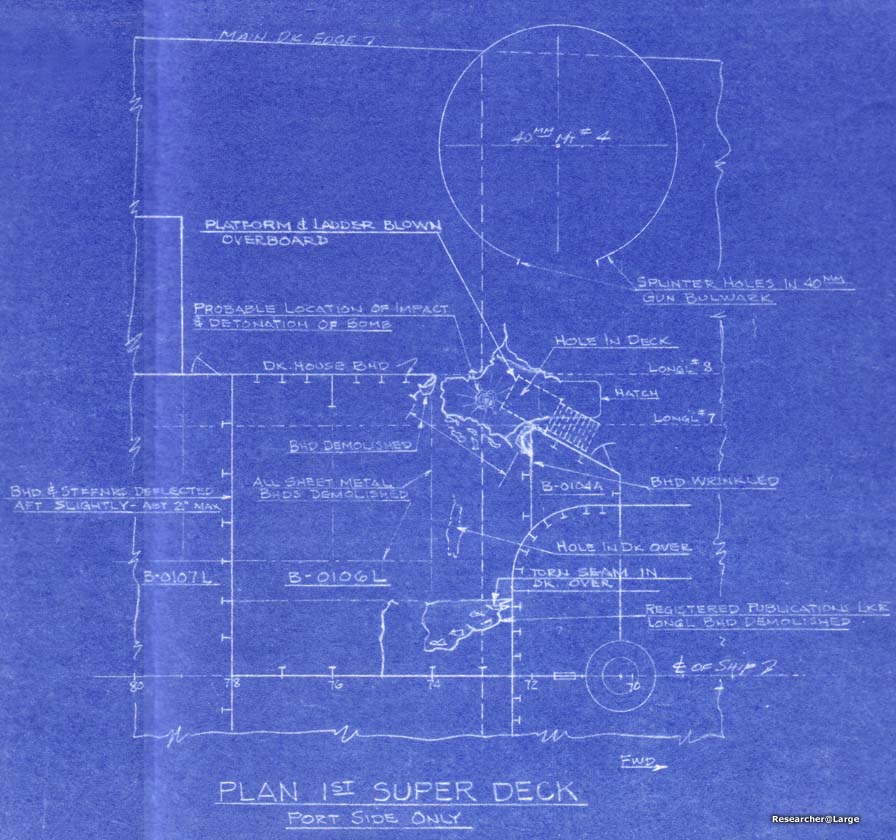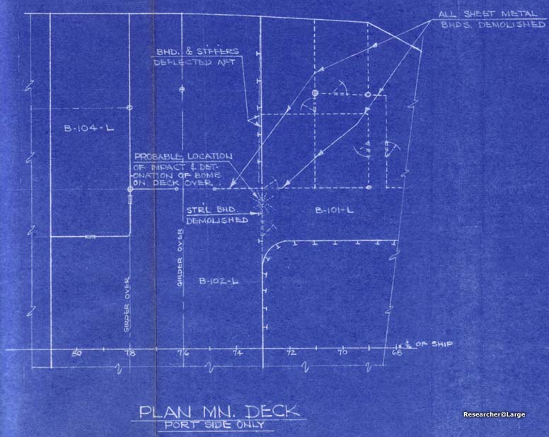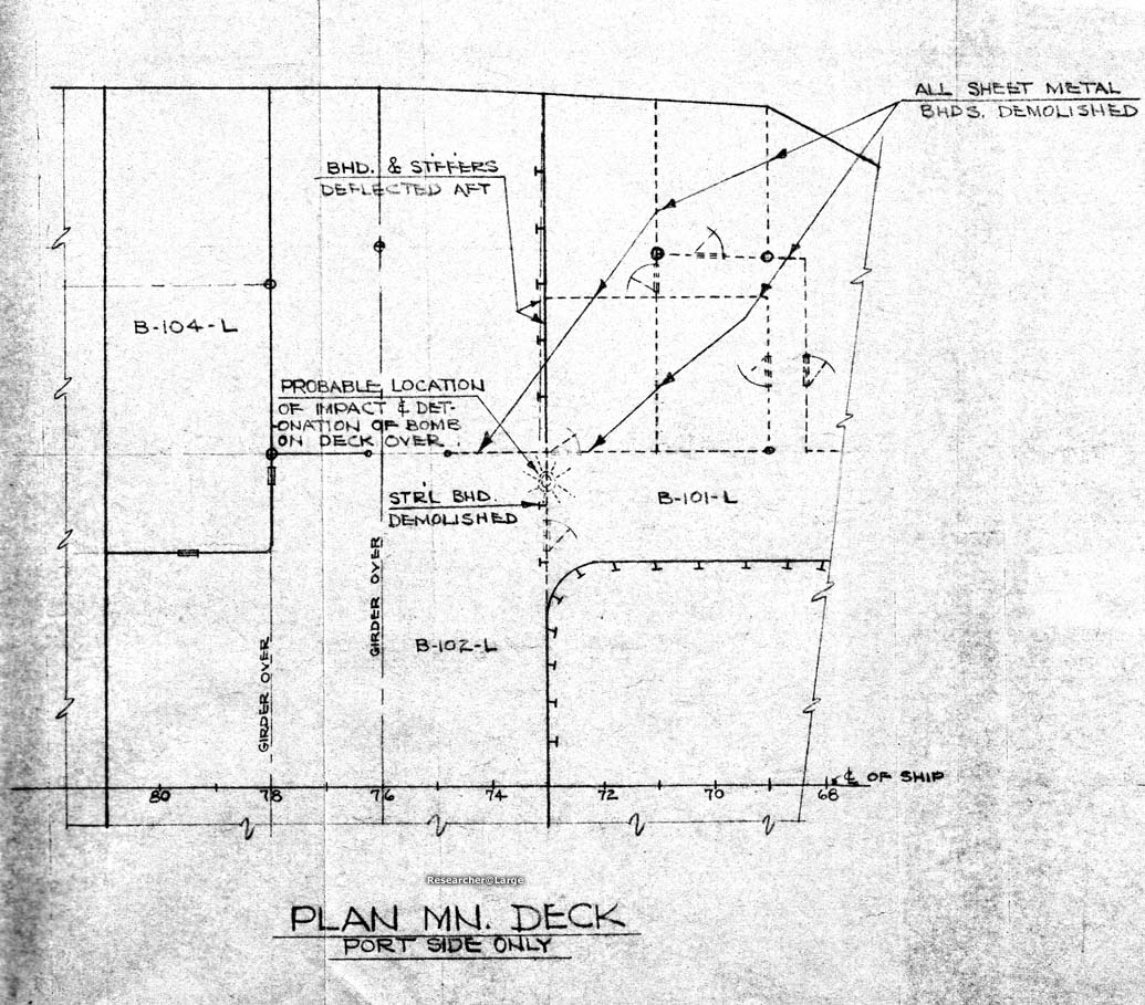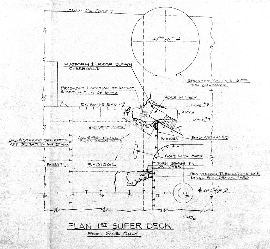 l. The principal structural damage occurred in the immediate vicinity of the bomb hit although fragments pierced structure at some distance from this point and the blast deflected or destroyed light divisional bulkheads and fixtures on the main and Ol decks. The radius about the point of impact within which appreciable damage occurred is approximately 20 feet. 2. The hole torn in the 01 deck at the point of the explosion is shown on the ships photograph's nos. 1, 2, 14, 19, 28, 36, 42, and 46 and the attached sketch. The temporary patch installed over the hole appears on P.S.N.Y. photographs nos. 2217-44, 2218-44, and 2225-44. The portion of the deck house bulkhead which was blown in is shown on the ships photographs nos. 2 and 46 and the attached sketch. A temporary patch was also installed over this hole and is shown on P.S.N.Y, photographs nos. 2221-44, 2222-44, and 2225-44.3. It is of interest to note that the light sheet metal bulkhead on frame 89, starboard side, and shown on ships photograph no. 41, was bulged aft, although it was about 80 feet from the point of explosion and the intervening structure was not affected. 4. It was noted that in most cases, damaged welded stiffeners, deck beams, and welded seams in decks and bulkheads within the blast area were broken adjacent to the weld and parallel to it. One instance of this is shown on ship's photographs nos. 21 and 22. 5. The additional photographs herewith and the ship's report, reference (a) give a detailed picture of the damage which need not be repeated in this report. 6. It is believed that the ship's structure stood up well under the effects of the explosion and no major changes in design are warranted. It does appear however, that increased protection for gun crews on the inboard side of gun mounts would be desirable.