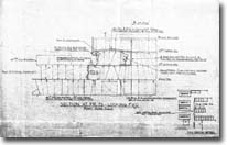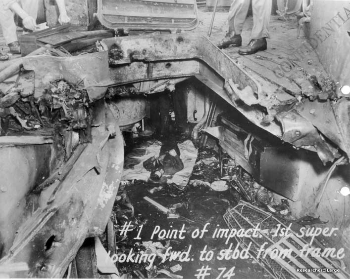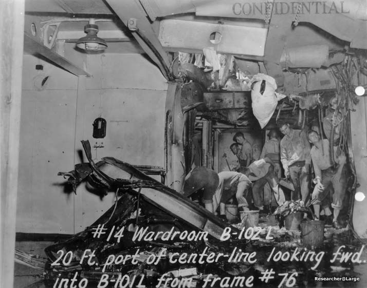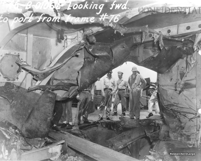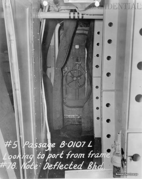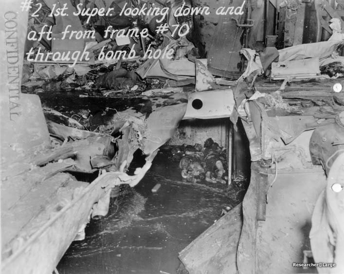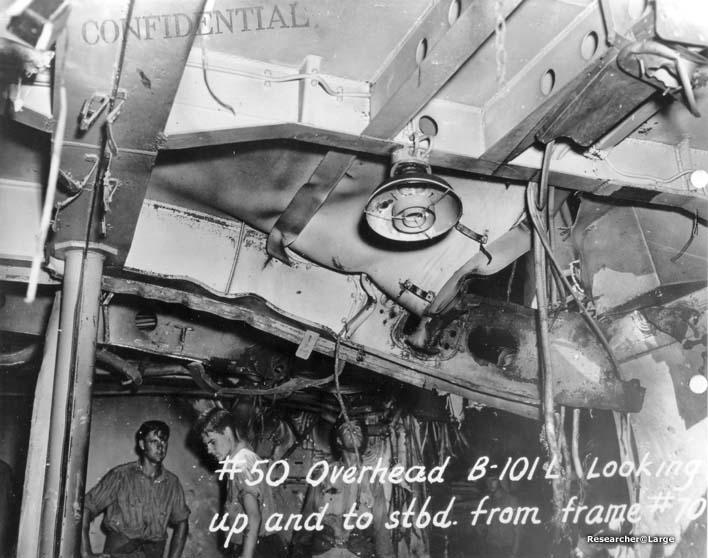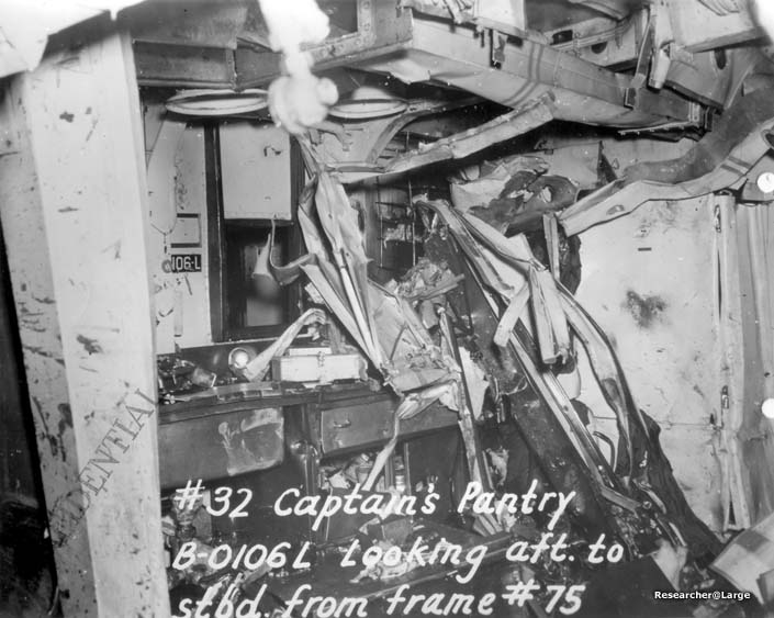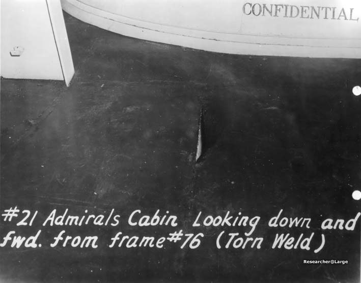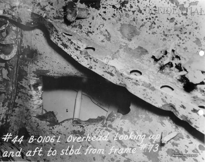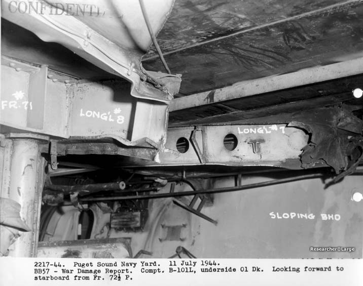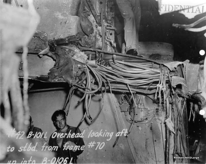 l. The principal structural damage occurred in the immediate vicinity of the bomb hit although fragments pierced structure at some distance from this point and the blast deflected or destroyed light divisional bulkheads and fixtures on the main and Ol decks. The radius about the point of impact within which appreciable damage occurred is approximately 20 feet. 2. The hole torn in the 01 deck at the point of the explosion is shown on the ships photograph's nos. 1, 2, 14, 19, 28, 36, 42, and 46 and the attached sketch. The temporary patch installed over the hole appears on P.S.N.Y. photographs nos. 2217-44, 2218-44, and 2225-44. The portion of the deck house bulkhead which was blown in is shown on the ships photographs nos. 2 and 46 and the attached sketch. A temporary patch was also installed over this hole and is shown on P.S.N.Y, photographs nos. 2221-44, 2222-44, and 2225-44.3. It is of interest to note that the light sheet metal bulkhead on frame 89, starboard side, and shown on ships photograph no. 41, was bulged aft, although it was about 80 feet from the point of explosion and the intervening structure was not affected. 4. It was noted that in most cases, damaged welded stiffeners, deck beams, and welded seams in decks and bulkheads within the blast area were broken adjacent to the weld and parallel to it. One instance of this is shown on ship's photographs nos. 21 and 22. 5. The additional photographs herewith and the ship's report, reference (a) give a detailed picture of the damage which need not be repeated in this report. 6. It is believed that the ship's structure stood up well under the effects of the explosion and no major changes in design are warranted. It does appear however, that increased protection for gun crews on the inboard side of gun mounts would be desirable.