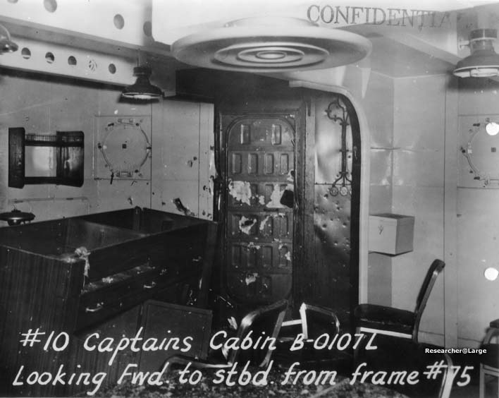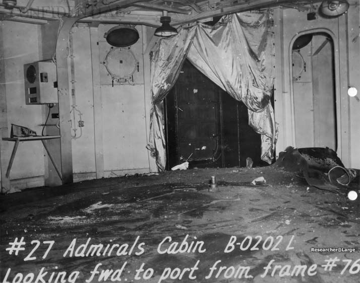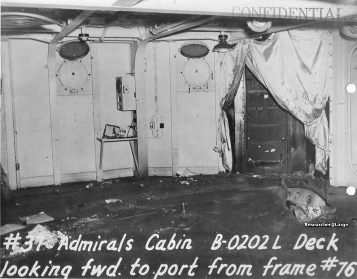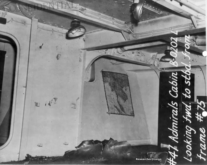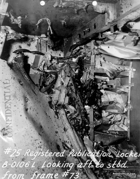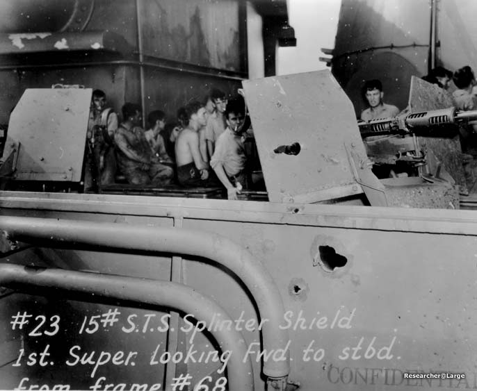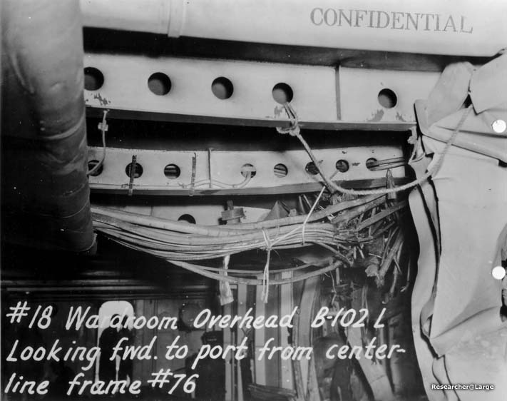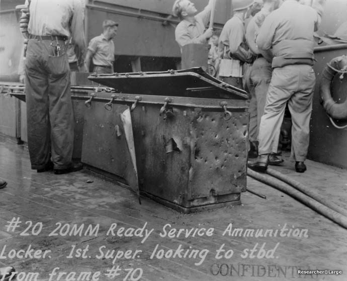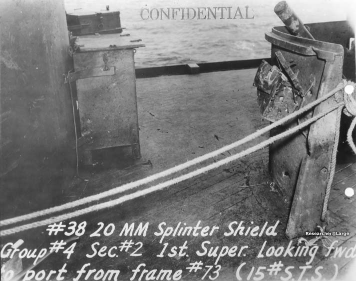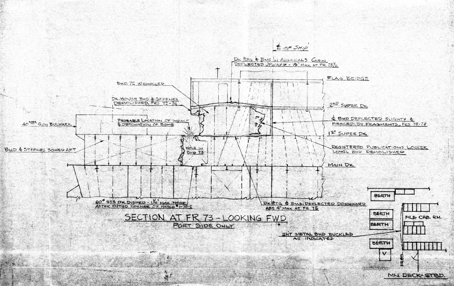SECT. VII - ORDINANCE 1. Ordnance equipment damage was limited to the 40 mm Quad. Mount No. 4, the 5" loading machine, and 20 MM Ready Service boxes, the details of which are thoroughly covered in reference (a). In connection with the damage to the 40 mm mount involving the severing of electric cables and hydraulic piping by splinters (see ship's photo No. 34) it will be noted that this damage would have been minimized if the splinter shield had been continuous on the inboard side. 2. The 20 mm ready service boxes on the 01 deck, port side frame 67, shown on ship's photograph no. 20 were so badly damaged by fragments that they were thrown over the side. In spite of this severe damage no ammunition in the boxes exploded. However the boxed 40 mm ammunition which had been passed to the Ol deck for the no. 4 mount and was stowed about 10 feet from the point of impact of the bomb all exploded. 3. It is of interest to note that the Radar equipment Mk. 4 transmitter located in the passage between the Admiral's cabin and the Senior Staff Officer's cabin at about frame 76 on the 02 deck which is approximately 30 feet from the point of the explosion was not injured. The transmitter was in operation at the time and continued to operate satisfactorily without the necessity for re-tuning. Since the transmitter operator was thrown 10 to 15 feet by the force of the explosion the transmitter undoubtedly received a severe shock. 4. No damage was sustained by radio or other radar equipment.