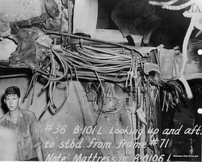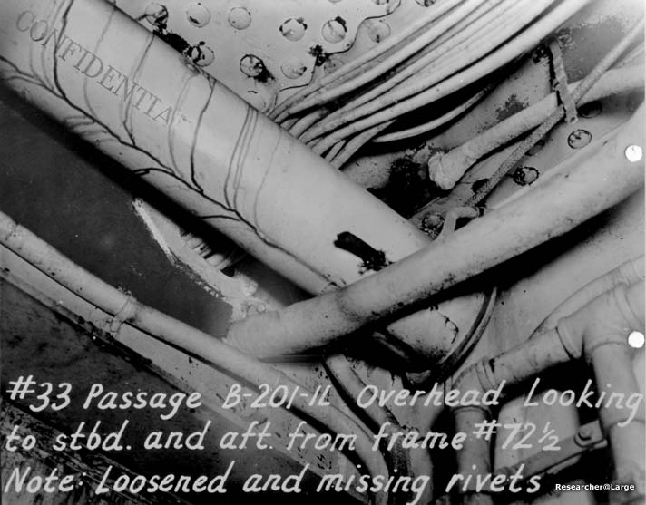 SECT. VI - ELECTRICAL 1. The greatest damage to electrical equipment occurred in the port passage on the main deck between frames 68 and 78. A fore and aft cable rack under the 01 deck was located directly under the point of impact and was consequently completely destroyed in this area. Other cables adjacent to the rack, ship's service telephone trunk line, connection boxes, various fixtures and fittings, etc., were also demolished. Some of the above damage can be seen on the ship's photographs nos. 14, 18, 19, 28, 36, 39, and 50. 2. In the case of connection and distribution boxes, fixtures, and fittings, it was observed that in general they were either completely demolished or remained serviceable. On the other hand comparatively delicate instruments such as ship's service telephones, announcing loud speakers, etc., which cannot stand severe shock were extensively damaged as described in reference (a). 3. A great deal of local wiring and equipment in the area just outboard of the centerline, frames 72 to 78 port side, under the Ol deck, was destroyed. However no vital electrical circuits or equipment were located in this area. The ship's photographs nos. 25, 32, and 46 show the general extent of this damage. 4. The destruction of the wire rack and adjacent wiring in passage B-101-L, mentioned in paragraph one above, severed a number of electrical cables which are listed under the heading of either vital or semi-vital and non-vital with comments as follows: VITAL CIRCUITS