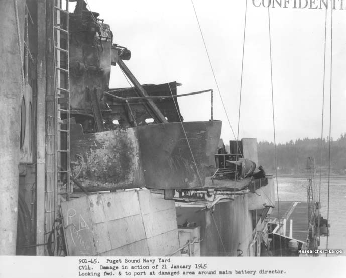 901-45 | Damage in action of 21 January 1945. Looking fwd. & to port at damaged area around main battery director. |