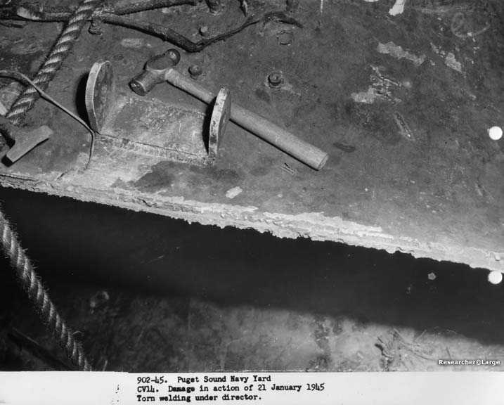 907-45 | Damage in action of 21 January 1945. Deck welding under director fdn. Note intact double head weld, foundation torn away. |