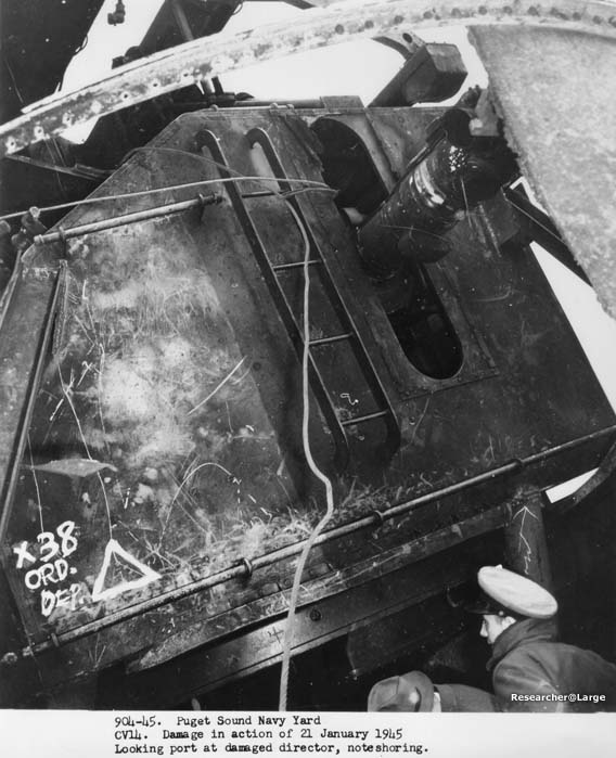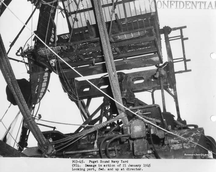 903-45 | Damage in action of 21 January 1945. Looking port, fwd. and up at director. |