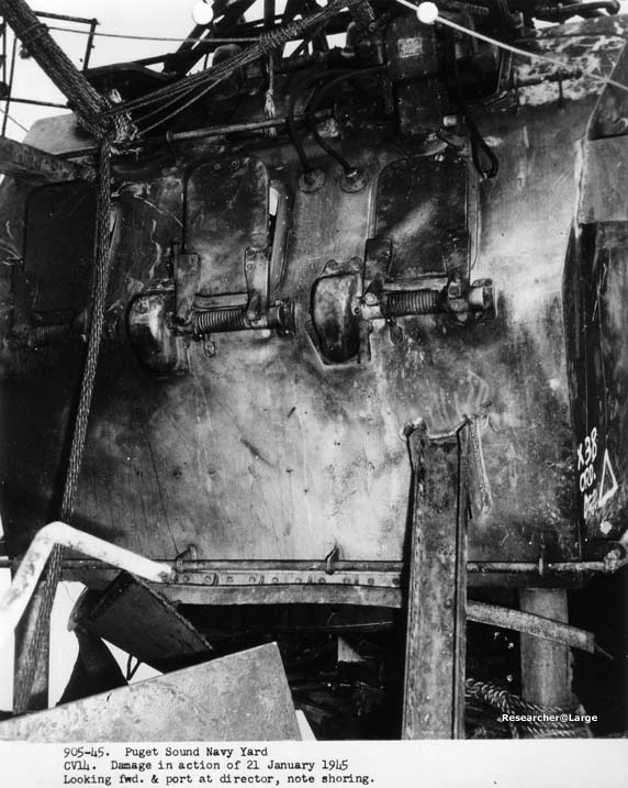 904-45 | Damage in action of 21 January 1945. Looking port at damaged director, note shoring. |