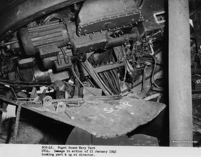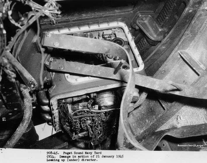 909-45 | Damage in action of 21 January 1945. Looking port & up at director. |