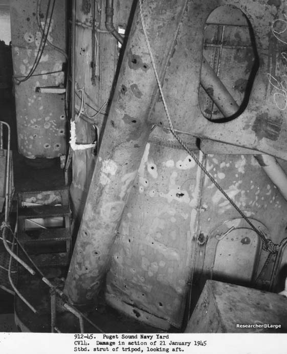 912-45 | Damage in action of 21 January 1945. Stbd. strut of tripod, looking aft. |