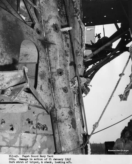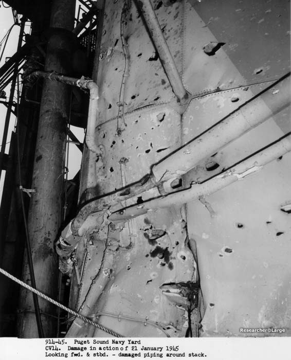 914-45 | Damage in action of 21 January 1945. Looking fwd. & stbd. - damaged piping around stack |