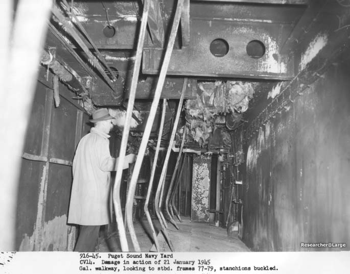 916-45 | Damage in action of 21 January 1945. Gal. walkway, looking to stbd. frames 77-79, stanchions buckled. |