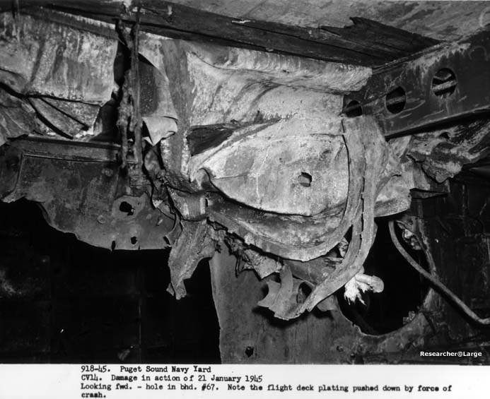 918-45 | Damage in action of 21 January 1945. Looking fwd. - hole in bhd. #67. Note the flight deck plating pushed down by force of crash. |