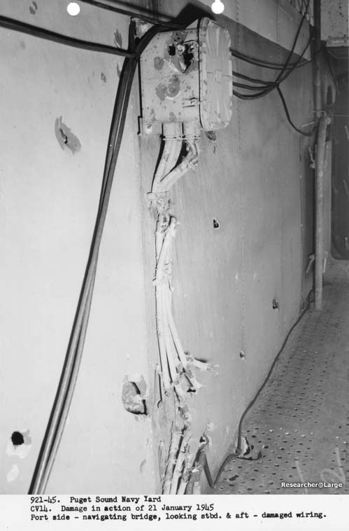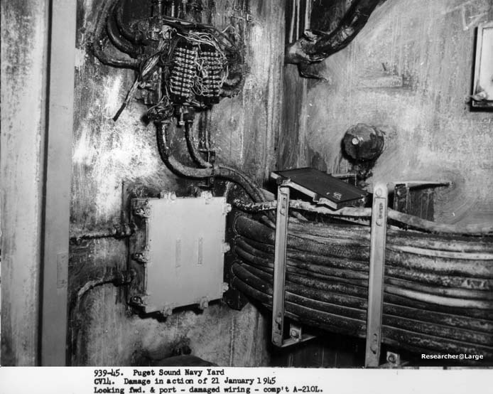 919-45 | Damage in action of 21 January 1945. Damaged wiring stbd. side Island - 05 level, looking up & port. |