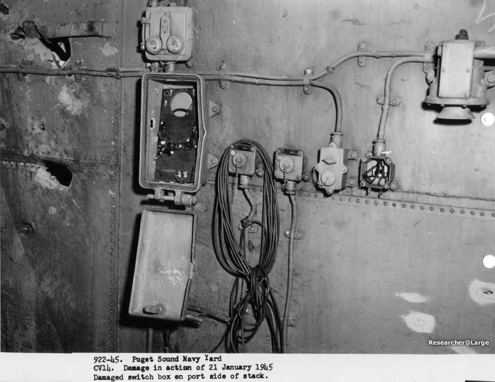 922-45 | Damage in action of 21 January 1945. Damaged switch box on port side of stack. |
