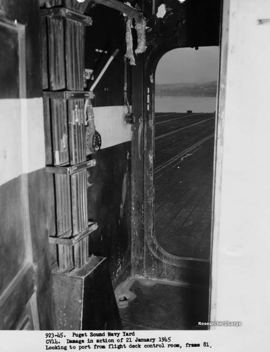 923-45 | Damage in action of 21 January 1945. Looking to port from flight deck control room, frame 81. |