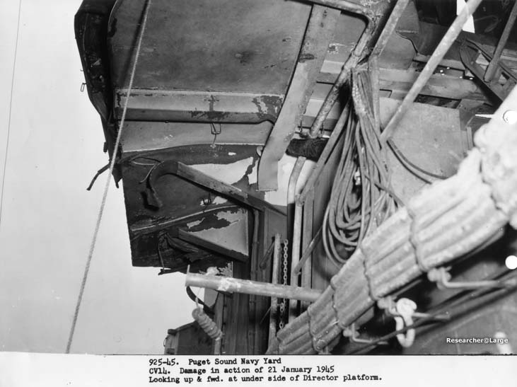 925-45 | Damage in action of 21 January 1945. Looking up & fwd. at under side of Director platform. |