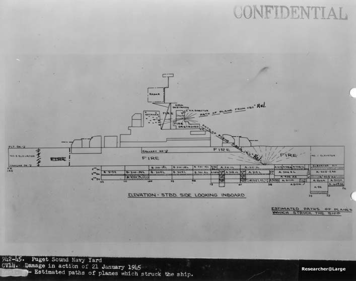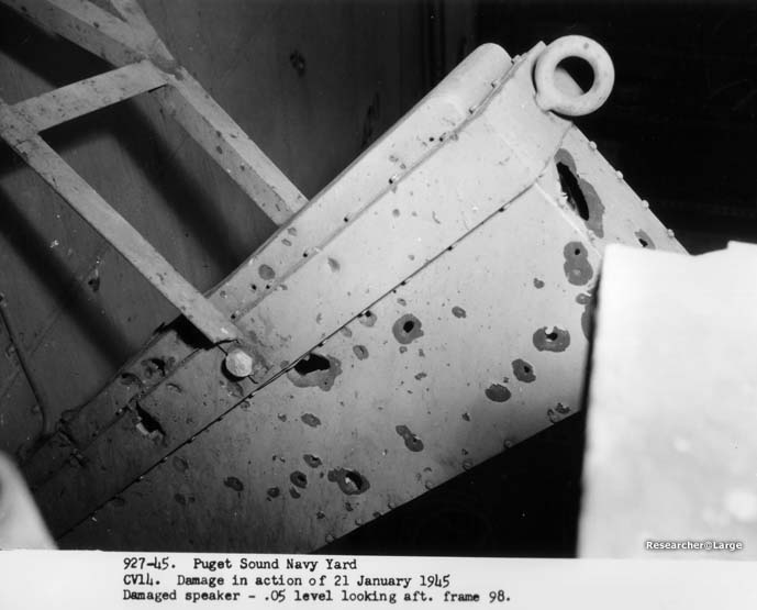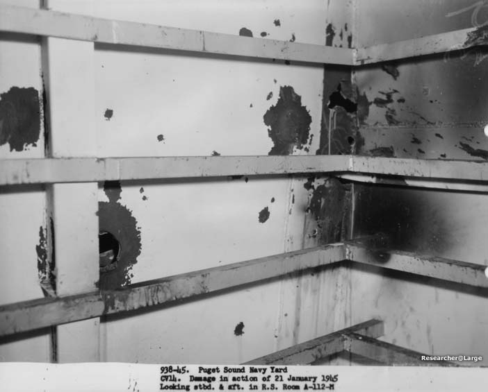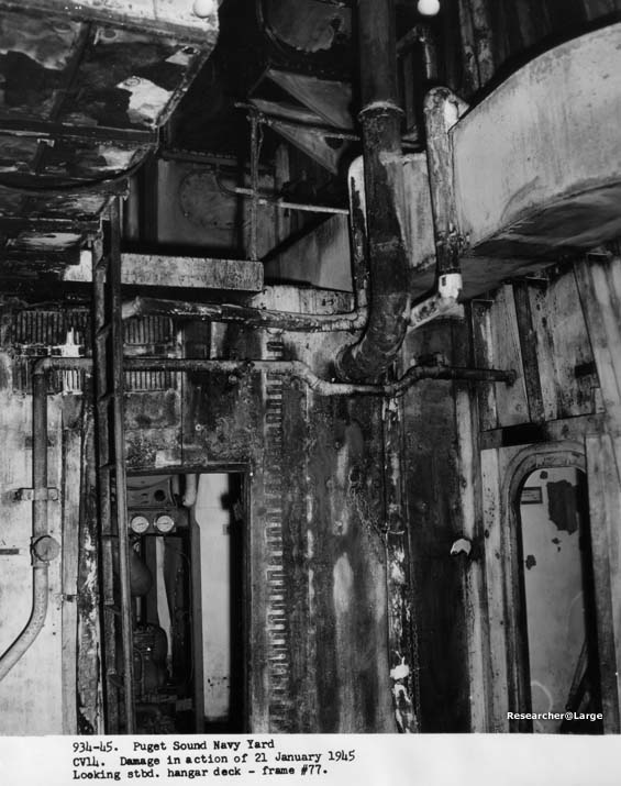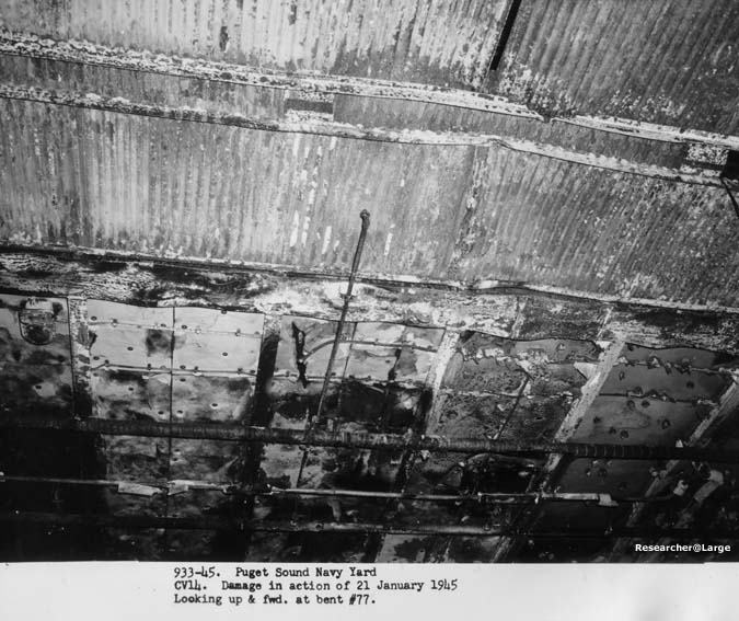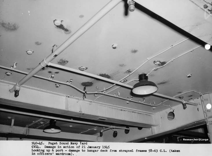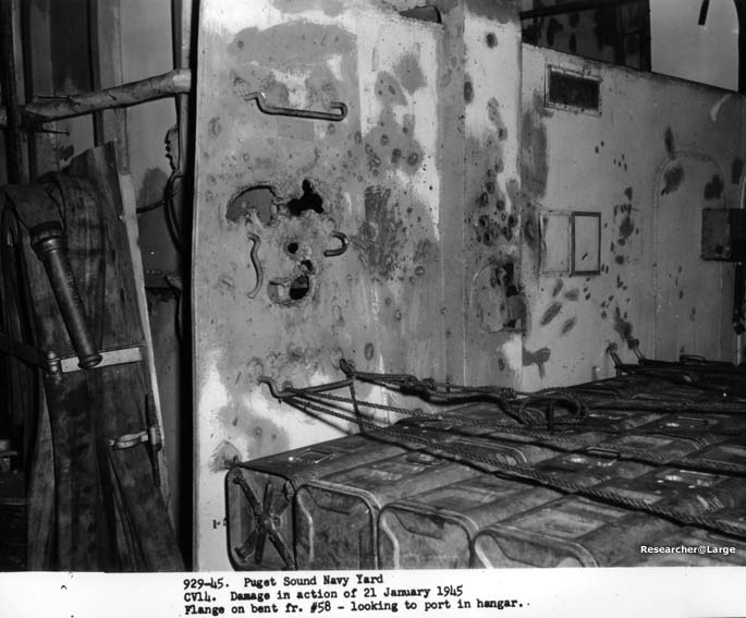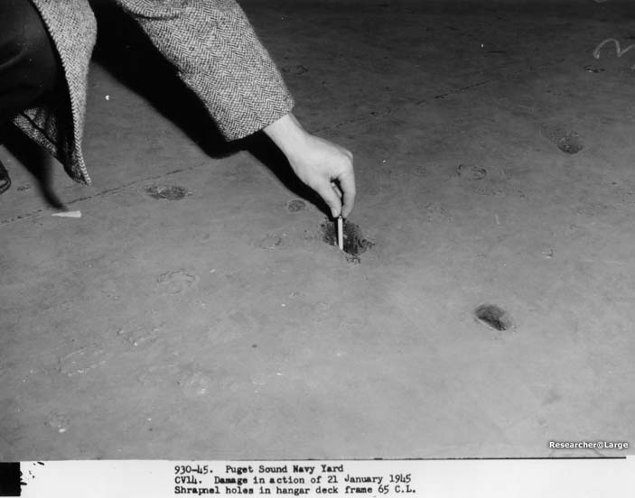 930-45 | Shrapnel holes in hangar deck frame 65 C.L. |