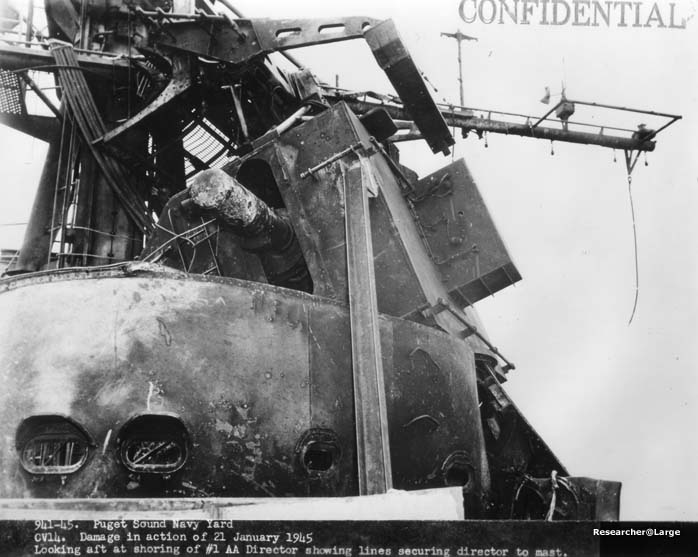900-45 | Damage in action of 21 January 1945. Looking fwd. & stbd. at damaged director. |