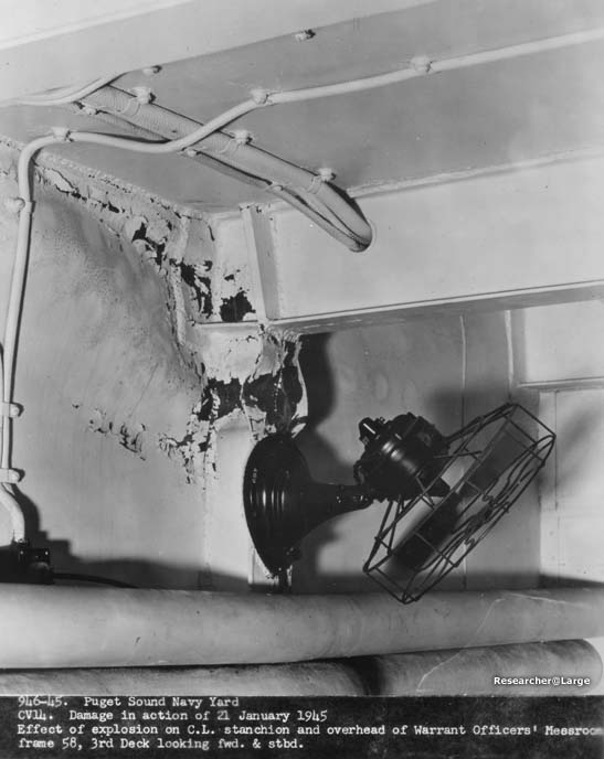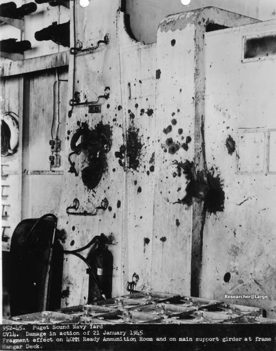 952-45 | Fragment effect on 40mm Ready Ammunition Room and on main support girder at frame 5?? (Cut off on picture, but this compartment was between frames 54 to 58 according to the report) Hangar Deck. |