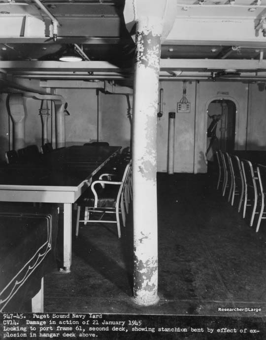 947-45 | Looking to port frame 61, second deck, showing stanchion bent by effect of explosion in hangar deck above. |