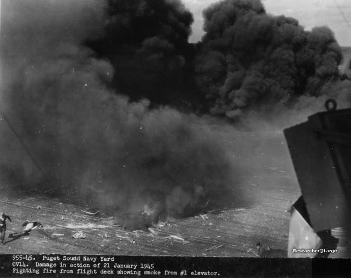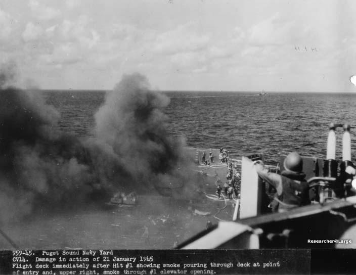 959-45 | Flight deck immediately after Hit #1 showing smoke pouring through deck at point of entry and, upper right, smoke through #1 elevator opening. |