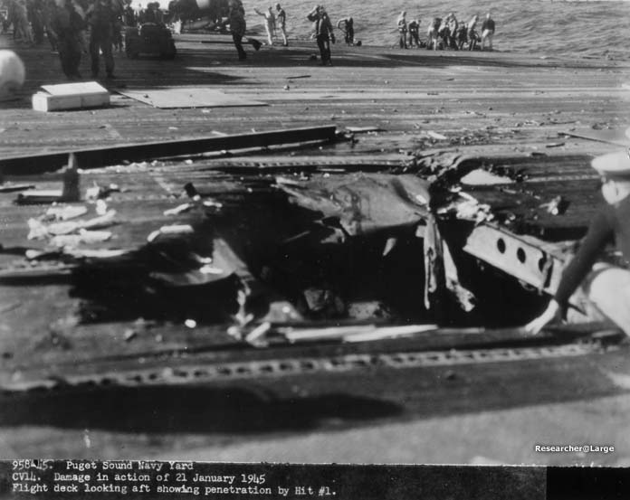 958-45 | Flight deck looking aft showing penetration by Hit #1. |