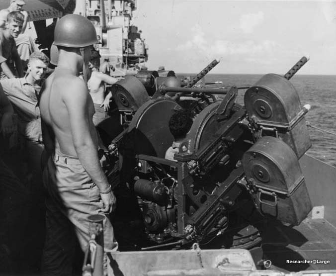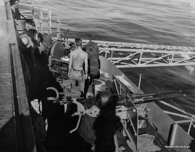 F. Mounts were damaged on two occasions as, a result of air operations. (1) on 6 June 1945 Mount No. 5, Ser. 61805, was covered with flaming gasoline, foamite, and salt water as a result of an airplane crash on the flight deck. The mount cover was burned and throvn overboard. The gunsight and firing solenoid wire insulation was slightly damaged but the mount remained operative. No serrious damage resulted. (2), On 8 July 1945 Mount No. 6, Ser. 61790 was damaged beyond repair when an aircraft crashed on the gun sponson during landing operations. The mount was removed and stripped of usable parts for spares. A twin 20mm mount was installed in its place. Useful note for modelers! See the photo of Mount six below if you need help figuring out where this was. 4. Recommendations on Group Arrangement.