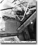 SECTION VIII - EFFECT OF FLOODING ON STABILITY 1. Compartments A-205-L and A-206-E were flooded as a result of damage. Flooding in these spaces was a combination of oil from ruptured tanks A-2F, A-3F, A-5F, A-6F, and A-7F, and the inrushing sea through ruptured shell plating frames 54 to 60. The liquids in the spaces is estimated to have reached a depth of 4 ft. maximum, however, maneuvering while under attack varied the amount. 2. It is estimated that the loss in GM due to free surface was approximately 0.41 ft., and the loss in GM due to added weight was approximately 0.03 feet. Since the ship was in Full Load Condition at the time of damage, the stability of the vessel was not seriously affected. The ship reported a list of 2° port after sustaining damage. It is believed that this was caused by flow of oil through punctured bulkheads and subsequent equalizing of oil from one tank to the other. 3. It is noted that reference (a) reported a measured period of roll of about 8 seconds. This would correspond to a GM of about 4 feet for still water rolling. A recent inclining experiment performed on the vessel at this Yard indicates that the GM at the time of the hit was about 2 to 2.5 feet. It has been observed that the period of roll taken at sea is generally less than that obtained by forced rolling in still water and therefore the indication of GM obtained is too high. Obviously stability data obtained in this manner should be used with caution.