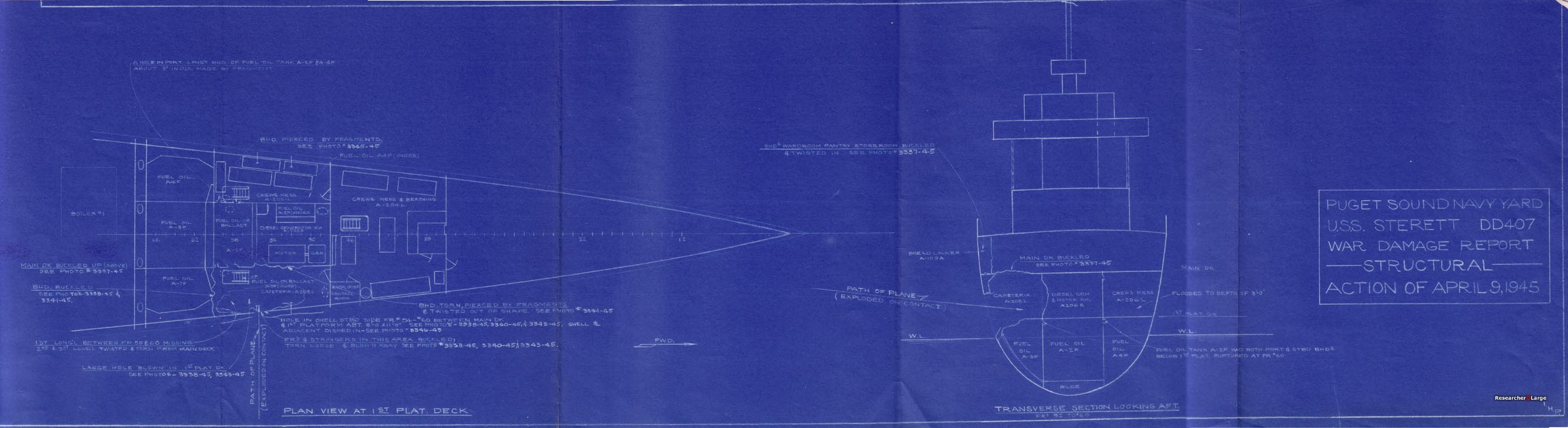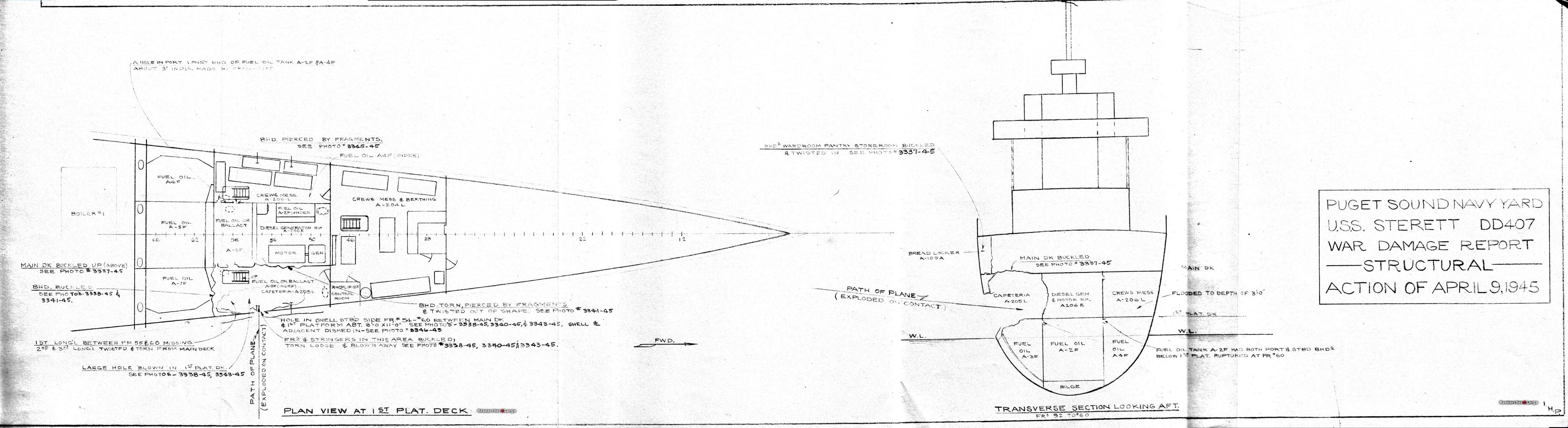 WAR DAMAGE REPORT - U.S.S. STERETT (DD407) SECTION I - INTRODUCTION l. While operating off Okinawa on 9 April 1945, the U.S.S. STERETT was attacked by Japanese planes (Vals) and at about 1852 was struck by one of the planes. The plane hit the ship at frame 55 just above the First Platform. It is believed that this plane carried an 8-inch projectile or a 250 lb. A.P. bomb which exploded on contact. The damage control measures taken and the damage sustained are well described in reference (a). After arrival at the Yard the vessel was inspected and the damage discussed with ship's personnel. The additional data found and the Yard's comments are furnished in the following paragraphs: