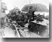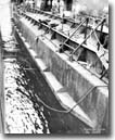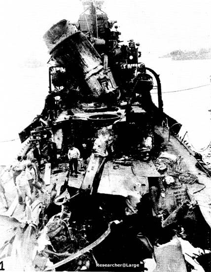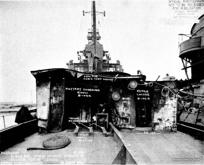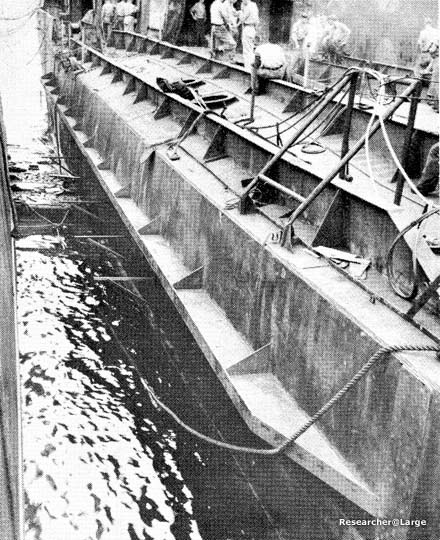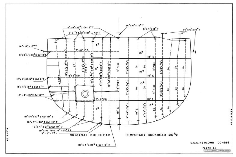 3. The shell plating was slightly distorted on both sides between frames 100 and 140, the maximum being 6" at frame 120. Bulkheads 110 and 131 1/2 were destroyed so that B-2, B-3-1 and B-4 flooded to the waterline. Bulkhead 92 1/2 was seriously bulged and damaged, but was intact to within five feet of the main deck, so that there was only minor leakage into B-1-1. 4. At 2030 NEWCOMB was taken under tow for Keramo Retto, arriving there at 0930 the following morning. Initial salvage operations were directed toward stopping minor leaks, removing flood water, clearing debris in the damaged areas and establishing galley facilities to replace those destroyed by the fire. About one week later, NEWCOMB was drydocked and the following repairs were made: