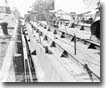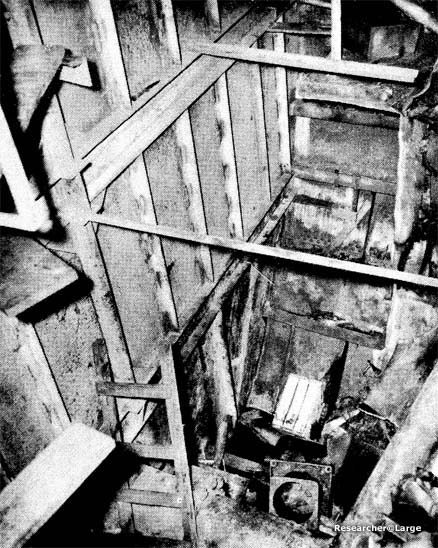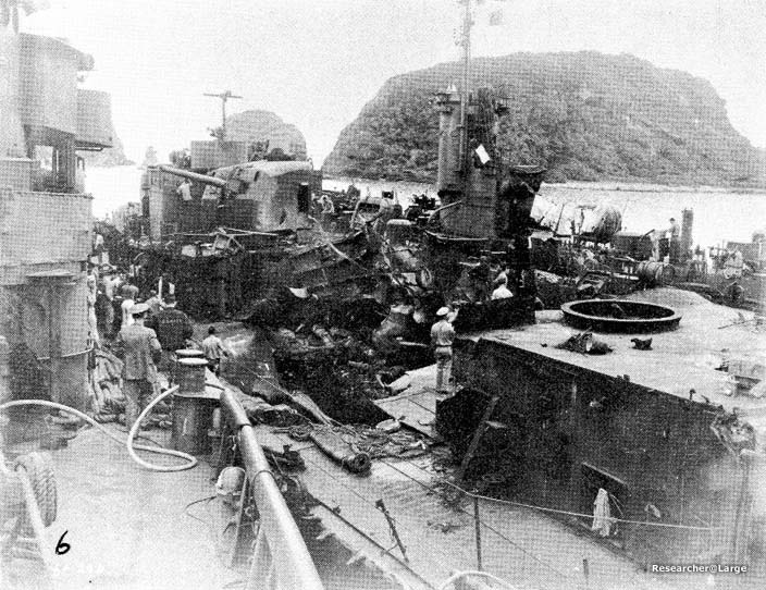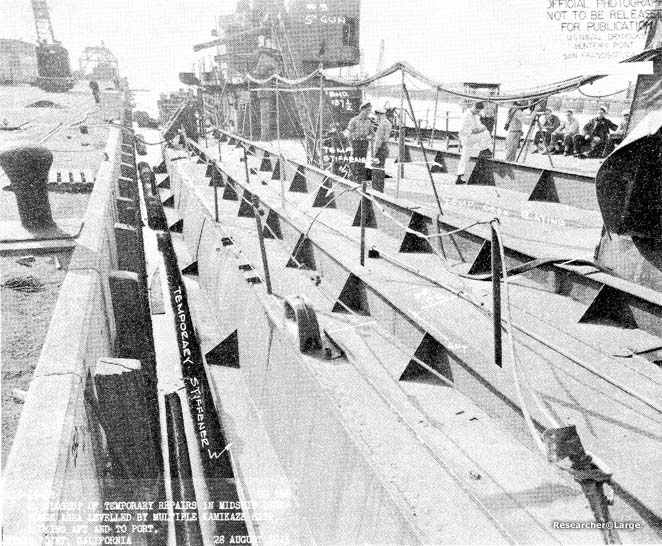 1. On 6 April 1945, NEWCOMB was serving as part of the screen for ST. LOUIS in support of minesweeping operations near Okinawa. Upon completion of this duty and while proceeding to rendezvous with a night retirement group, NEWCOMB was subjected to a concerted attack by seven Kamikaze aircraft. At 1800, one plane crashed into the after stack, putting the after fireroom out of operation and causing a fire in the upper handling room of 5" mount 3. Shortly thereafter, a second plane, carrying a bomb, crashed amidships in the vicinity of the torpedo workshop. The explosion of this bomb caused serious damage to both engine rooms, completely immobilizing the ship. The after stack, both torpedo mounts, amidship superstructure, 40 mm mounts and magazines were blown over the side (Photos 50 and 51). The main deck was ruptured between frames 108 and 135, the starboard side being blown upward and the port side downward. A fire raged throughout the after deckhouse and in the amidship area. A third plane crashed into the forward stack and added gasoline to the amidship fire. At 1811, LEUTZE came alongside to assist in firefighting. At 1815, anti-aircraft fire caused a fourth plane to swerve from its course toward the bridge and to crash amidships and cross to LEUTZE's fantail where it exploded. At 1830, BEALE came alongside and passed over fire hoses. All fires were under control by 1900 and at 1930 all fires were extinguished. 2. Damage to the underwater body was as follows: