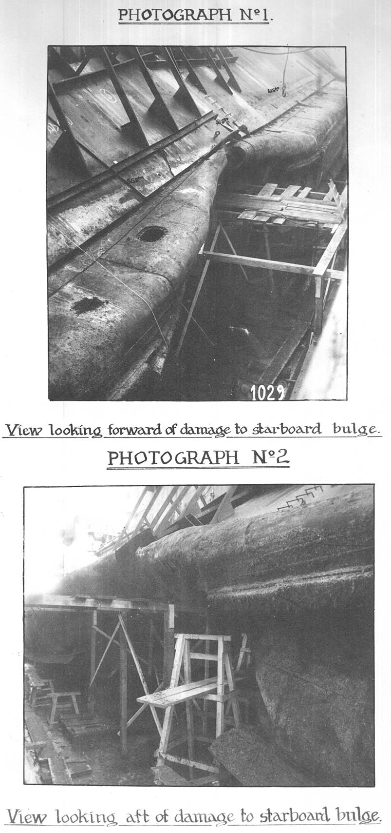 2. (20 lbs. M.S. and 20 lbs. "D") and side framing (6" x 3" x 3" x 17.53 lbs. channel bar) was destroyed over the inner, outer and water jacket compartments. The plating was missing from just outboard of the protective bulkhead, at keel level, up to, but not including, the top strake of the outer bulge. The top strake (30 lbs. M.S.), which extends outboard from the lower edge of the sloping armour, was fractured between stations 52 and 53, heavily buckled and stove inboard (see photograph No. l). 15. Forward to station 45 and aft to station 62, the outer bottom plating (20 lbs. M.S. and 20 lbs. "D") together with the side framing (6" x 3" x 3" x 17.53 lbs. channel bar), from the longitudinal bulkhead at keel level to the lower edge of the sloping armour, was split, buckled and forced inboard. 16. Outside these limits, to stations 39 and 69, the bulge plating (20 lbs. M.S. and 20 lbs. "D") and framing (6" x 3" x 3" x 17.53 lbs. channel bar) suffered minor buckling and distortion. 17. The outer bottom plating (25 and 30 lbs. "D"), between stations 45 and 62 starboard side and inboard from the longitudinal protective bulkhead to within 4 feet of the middle line, was badly corrugated between frames. The bottom framing (3-½" x 3" x 9.02 lbs. angles) and floors (12 and 14 lbs. M.S.) were slightly distorted and riveted connections were strained and leaking. 18. The riveted connections of the sheer strake to the longitudinal protective bulkhead were torn away between stations 47 and 54. 19. The longitudinal stringer (20 lbs. "D" face plate and 20 lbs. "D" side girder), in the outer bulge compartment, was destroyed between stations 51 and 56, and severely distorted and forced inboard between stations 45 and 62. 20. The wooden rubbing strake (9" x 9" elm with 20 lbs. M.S. faoe plate) was missing or wrecked between stations 42 and 62. 21. The bilge keel (35 lbs. M.S.) was destroyed between stations 45 and 54, and suffered damage and buckling to stations 43½ and 62½.Sloping bulge armour and plating under. 22. Between stations 41 and 62 the sloping armour (l60 lbs. N.C.) was displaced and the plating under (20 lbs. "D"), was buckled and distorted. The fracture in the bulge plating, referred to in paragraph 14, continued across this plating, between stations 52 and 53, and extended for the full width of the armour. The connecting angle (7" x 7" x 28.42 lbs. "D") of this plating to the protective bulkhead was displaced between stations 49 and 56 and the rivets had pulled through. 23. The armour was displaced as stated below. (The frame stations referred to indicate the extent of each armour plate).