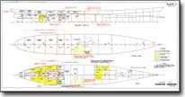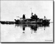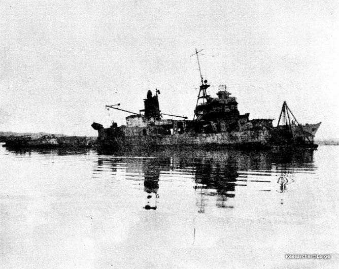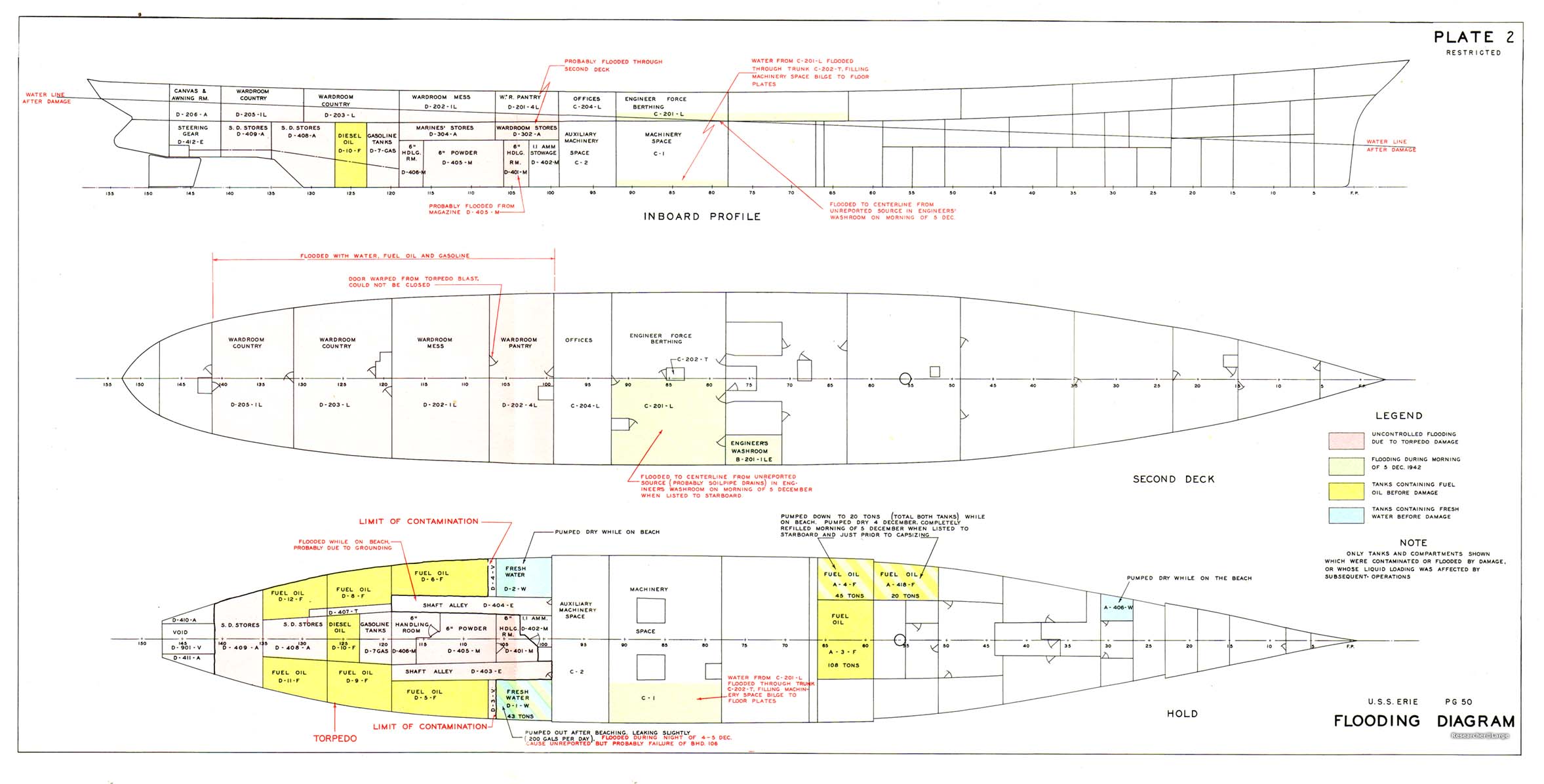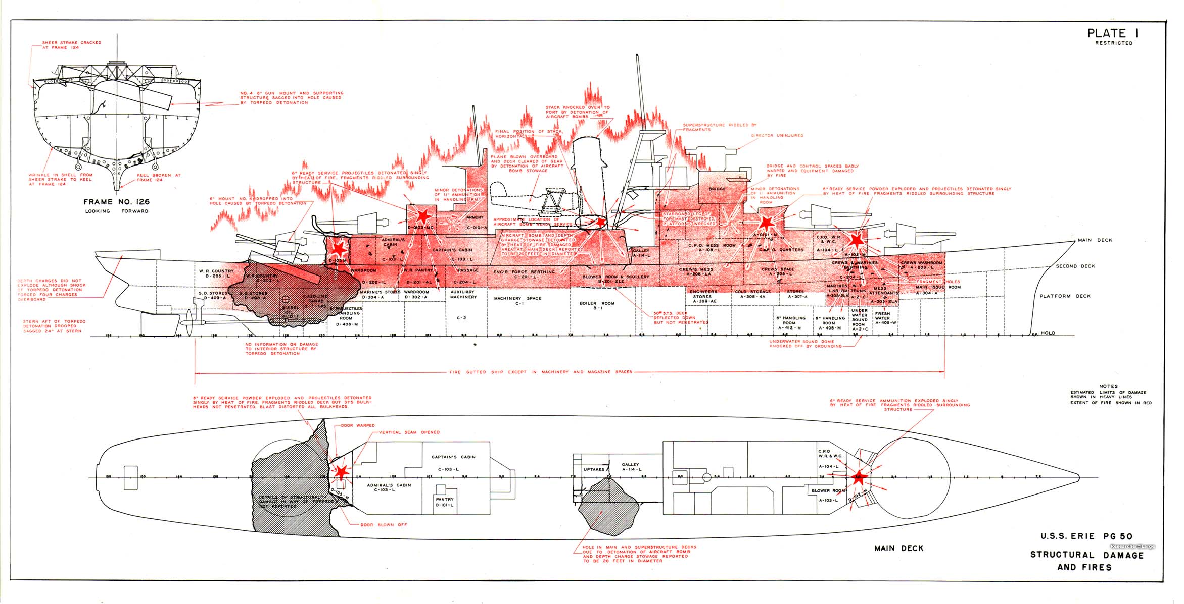 1. At 1733, 12 October 1942, a torpedo detonated about 5 feet below the waterline at frame 126, starboard (Plate 1, 2). The hull below the waterline was ruptured for a length of 45 feet. Transversely, the break extended from 5 feet to starboard of the keel up to the main deck and across the main deck almost to the port side (Photo 1). Fuel oil, diesel oil and gasoline tanks in way of the explosion were demolished, and the platform and second decks were ruptured. On the 2nd deck, bulkheads 119 and 131 were torn and the watertight door in bulkhead 107 was distorted and could not be closed. Oil and gasoline spread throughout the flooded 2nd deck compartments between bulkheads 99 and 141. This flooding represented about a 25% loss of waterplane area. A few seconds later a second explosion of considerable intensity occurred in the same area, probably the result of ignition of gasoline vapor. Fire, fed by gasoline and fuel oil, spread rapidly throughout the 2nd deck and through the after superstructure. Within 12 minutes, ready service ammunition for 6" mount 4 began to explode. 2. The torpedo detonation produced an initial list to port, but immediately thereafter ERIE began listing gradually to starboard and settling by the stern. Course across wind was maintained for a few minutes to prevent spread of the fire forward to the 6" ready service rooms and aft to the depth charge stowage. Increasing list and trim made sinking appear imminent, so course was changed to head for the beach about 4 miles away. List had increased to 15° and the main deck was underwater aft of frame 104 starboard when ERIE grounded at 1823. After grounding ERIE assumed a slight port list following the contour of the bottom. 3. After grounding, burning oil and gasoline spread forward and encircled ERIE, except for a small portion of the bow. Almost the entire superstructure was afire within 2 minutes. ERIE was abandoned at 1826, 3 minutes after