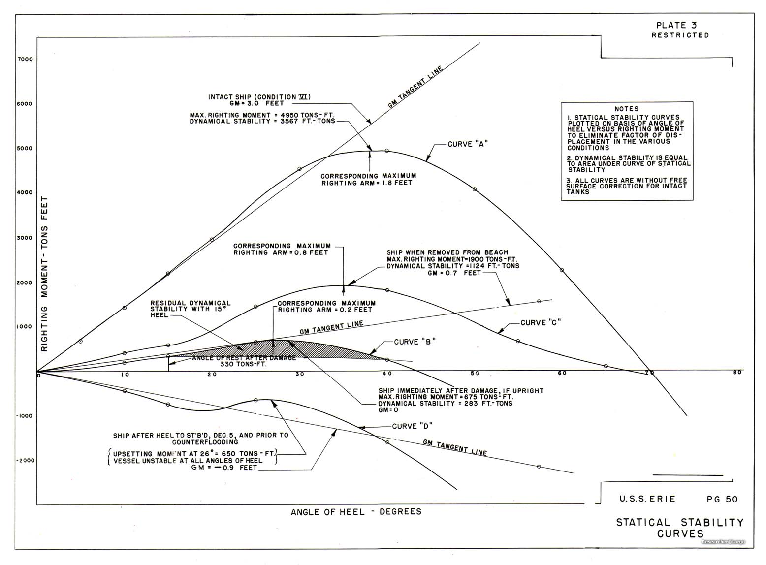RESTRICTED The center of gravity was lowered only 0.4' and GM was increased only to 0.7'. Curve C of plate 3 is the stability curve for this condition. At small angles, below about 15°, the effect of weight removal is not appreciable. The greatest effect was to increase the maximum righting moment to about 1900 tons-feet and to increase the range of stability nearly to the intact value. The total dynamic stability required for capsizing was increased to 1124 tons-feet, about 32% of the intact value. Although stability when ERIE was refloated was considerably better than it had been before beaching, ERIE was still in a critical condition. The 8 1/2° port list when ERIE was refloated could have been caused by unsymmetrical distribution of remaining weights. The flooding of the port shaft alley and the 20 tons remaining in A-4F and A-418F would have been sufficient to cause this list had ERIE been otherwise balanced. 10. The effects of the activities on 4 December, i.e., replacing the anchors and chain and removing 20 tons of liquid from A-4F and A-418F, was to reduce GM from 0.7' to 0.5', to reduce the port heeling moment by about 200 tons feet, thereby reducing the port list from 8 1/2° to 5°. Neither the removal of liquid nor adding of topside weight was advisable, even though initial stability remained positive after the operations. They indicate lack of appreciation of ERIE's poor stability condition. 11. D-1W apparently flooded slowly, since the list did not change abruptly. This flooding produced a 667-tons feet heeling moment, which from curve C would cause 18° total list. Since ERIE had a 5° port list, a 13° starboard list could be expected. Actually, the barge alongside prevented listing beyond 10°. Flooding of D-1W produced an after trimming moment of 5200 tons-feet which would cause a 34" change of trim, reasonably close to the 3' estimated by the Commanding Officer. Flooding of D-1W also caused a slight increase in GM. 12. The free surface effect, incident to the flooding on the 2nd deck, reduced GM by 1.6' to -0.9'. ERIE probably would have capsized to starboard had not the barge prevented. Counterflooding of A-4F and A-418F provided an ever increasing port moment. Curve D of Plate 3 is for D-1W flooded, free surface to the centerline of C-201L, and A-4F and A-418f empty. It is a close approximation of ERIE's stability condition immediately before counterflooding and capsizing. Since neither initial nor dynamic stability was positive, the only immediate action which could have saved ERIE was rapid removal of free surface in C-0-01L and cautious addition