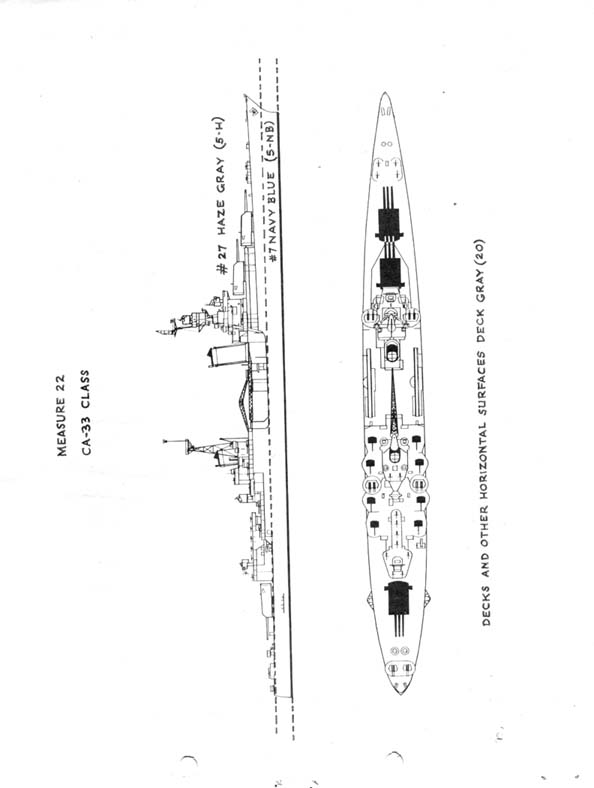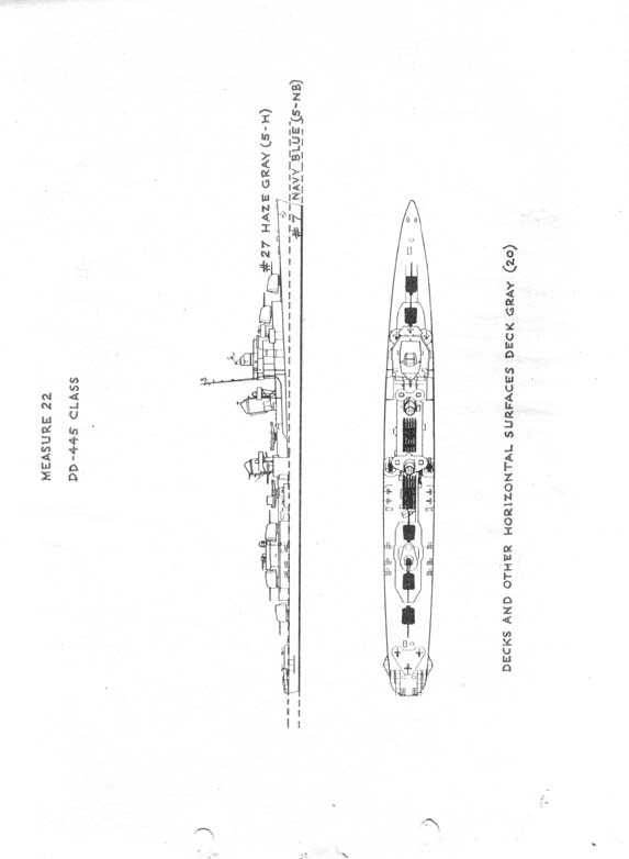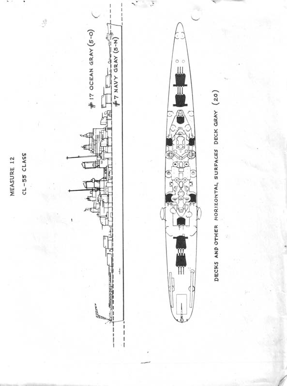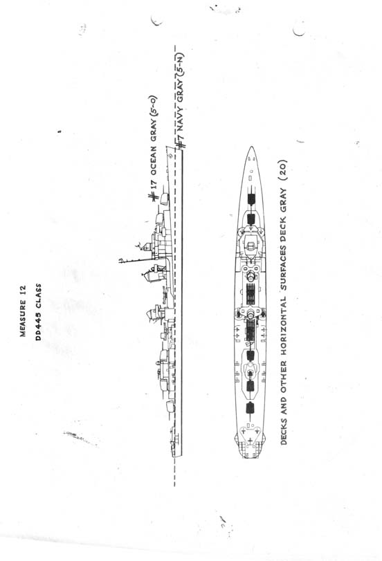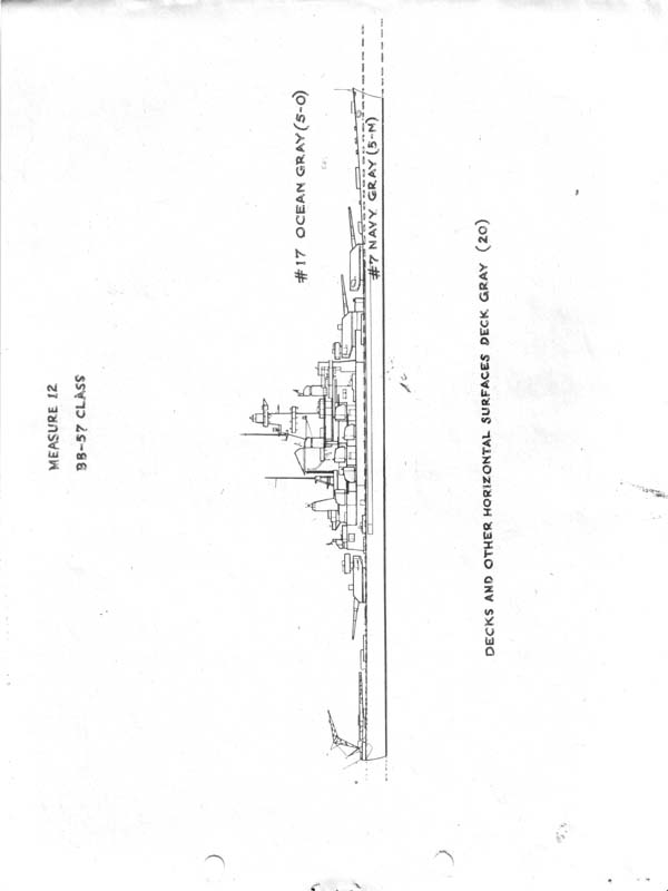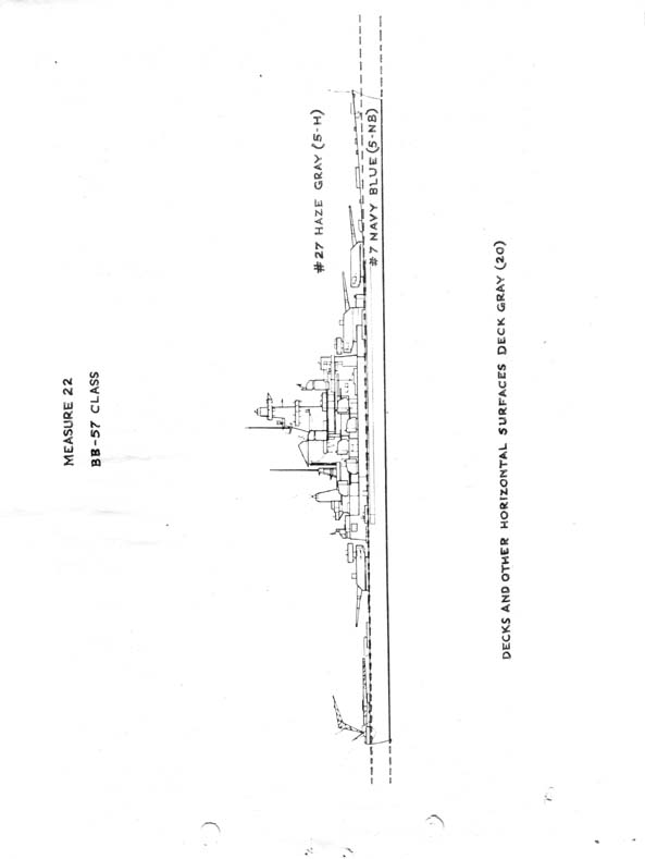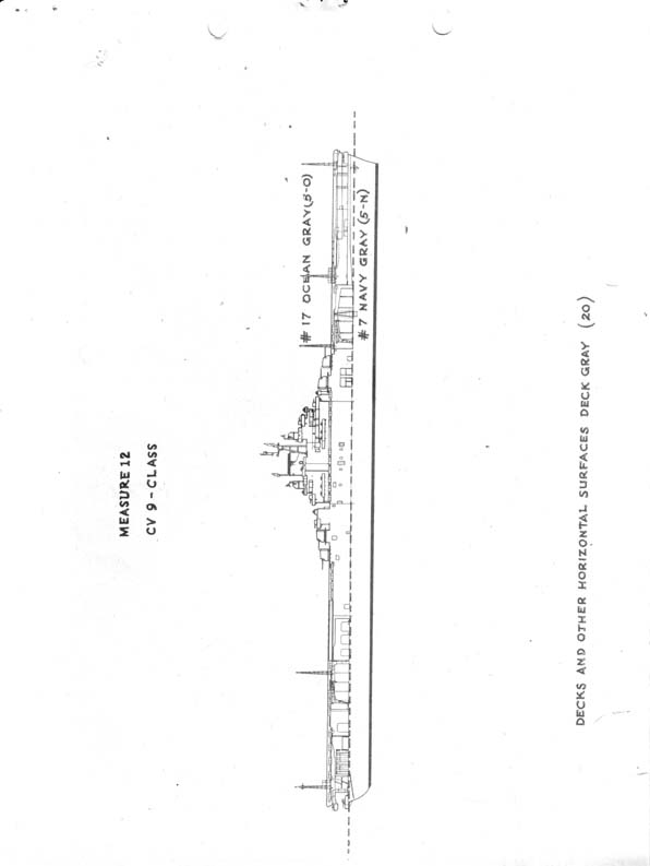 CAMOUFLAGE MEASURES 12, 21 AND 22 INSTRUCTIONS FOR APPLICATION MEASURE 12. Apply a horizontal band of #7 Navy Gray (5-N) for the entire length of the hull from the boottopping to the height of the main deck at its lowest point (on carriers to the height of the hangar deck). Above this level apply #17 Ocean Gray (5-O) to vertical surfaces including superstructure, stacks, and masts. In the absence of boottopping, extend lower band from light load line. Apply Deck Gray (20) to decks and all other horizontal surfaces exposed to the weather. MEASURE 21. Apply #7 Navy Gray (5-N) to all surfaces withthe following exception: Apply Deck Gray (20) to all deck and other horizontal surfaces. MEASURE 22. Apply a horizontal band of Navy Blue (5-NB) or #7 Navy Gray (5-N), if blue not available, to the hull for its entire length and extending from the boottopping to the height of the main deck at its lowest point (on carriers to the level of the hangar deck). Apply Haze Gray (5-H) to all vertical surfaces above that level. In absence of boottopping, extend lower band from light load line. Apply Deck Gray (20) to decks and all other horizontal surfaces exposed to the weather.