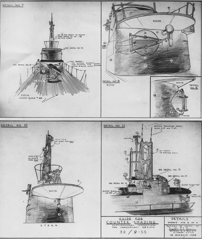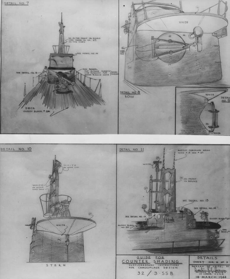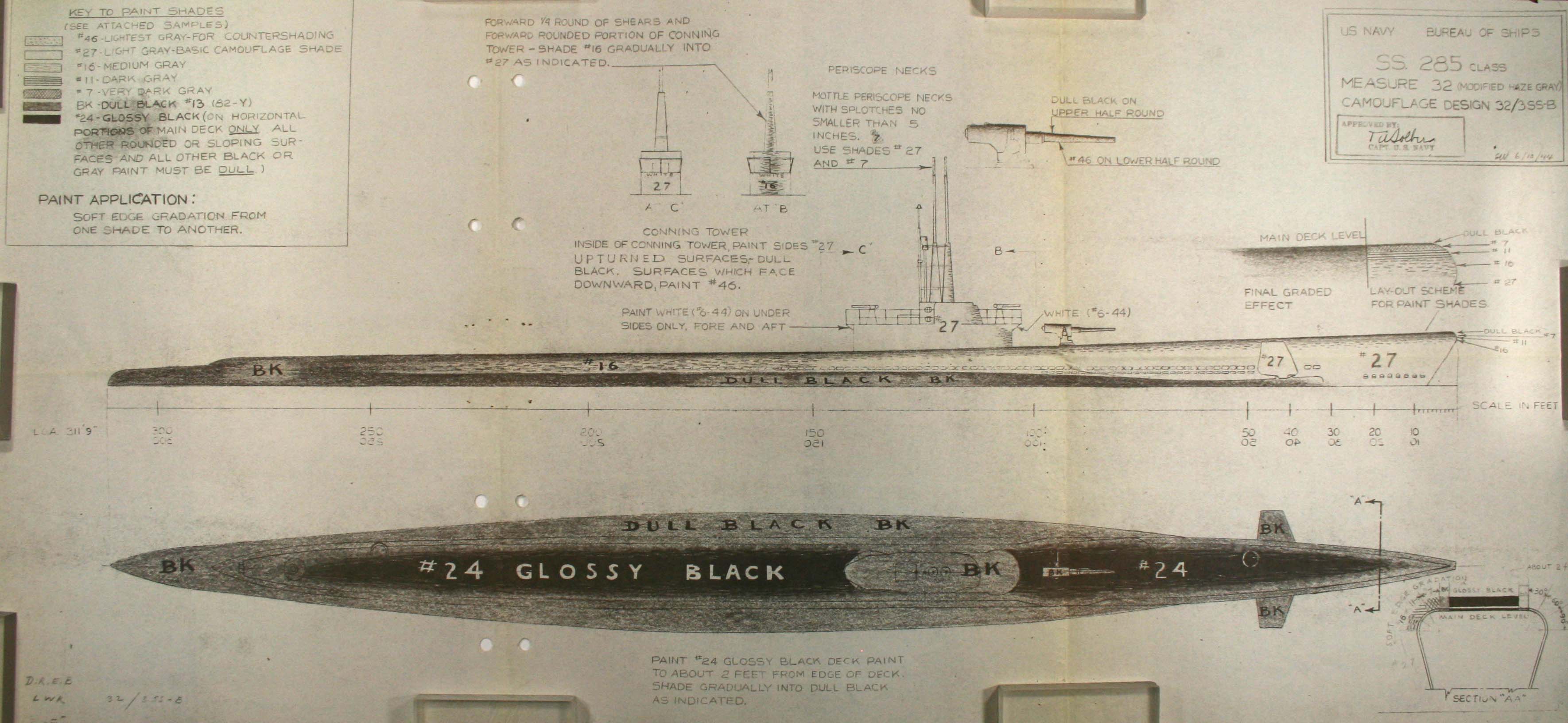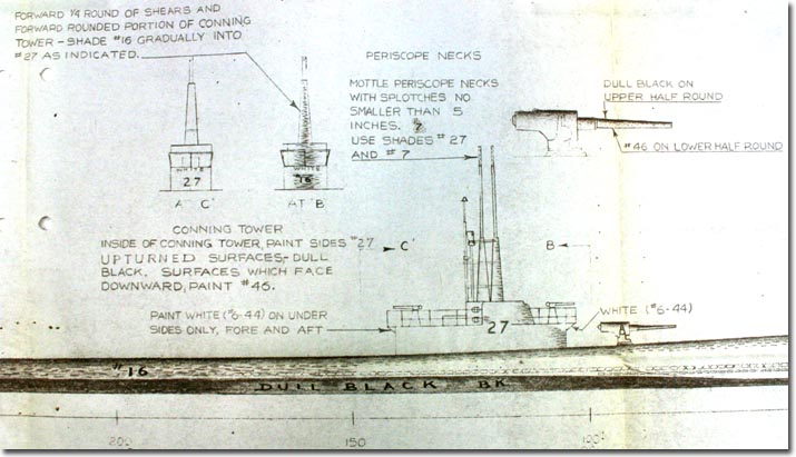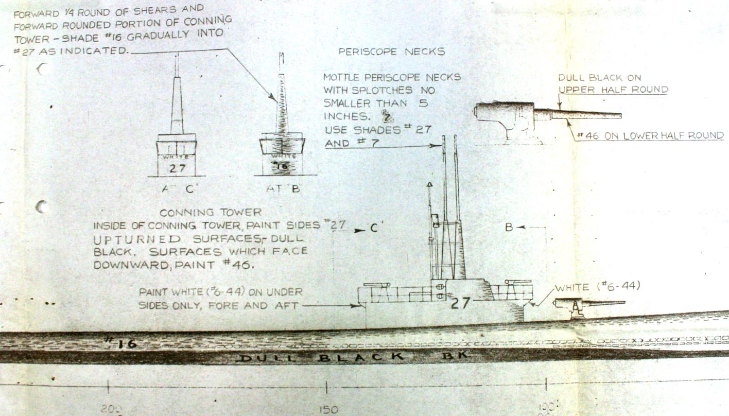 CONFIDENTIAL days, the glossy black approaches an eggshell finish which is near the ideal for low visibility. In case submarines are painted with less than 12 days before they are to arrive in their operating area, #24 Glossy Black should be cut with an equal part of Dull Black #13 or #82-Y. The "Dark Gray", design 32/9ss dated 18 March 1944, is less effective than the "Light Gray" for all surface work, However, it is the most difficult paint job to see at periscope depth and impossible to see in deep water below 150 feet. It has quite a bit of advantage over the plain black in other situations also and was designed especially for reconnaisance patrols in clear calm waters where enemy aircraft are the greatest danger. It is not bad for general patrol work, but the "Light Gray" is much better, especially at night. Even the so called "Light Gray" is too dark most of the time but to make it lighter would unduly increase its possibility of detection by enemy aircraft in the few situations that are bad. In applying the Submarine Concealment Camouflage painting there are a few things which seem to give every one a little trouble at first, even after paint samples and paint in mixed form are at hand, spray equipment is hooked up and the vessel is prepared for painting with its primer coat on. Dry and wet paint samples have been prepared by Navy Yard, P.H., and Sub Base, P.H. Six sets of dry samples have been prepared by the SPERRY. One set should be turned over to the Squadron Engineer and one to each Division Engineer aboard the SPERRY and BUSHNELL. Since all samples fade or darken in time, they should be replaced about once every five or six months, from Navy Yard, P.H., paint shop #71. Wet samples are being kept by the painter assigned to the Squadron Engineer on the SPERRY. A wet set should be kept by the BUSHNELL also. BuShips has been requested to make specifications for the submarine paint shades and to direct Navy Yard, Mare Island, paint factory to supply the shades in ready mixed form. Pending this arrangement, the shades will have to be mixed in the field. The tenders can do this for the divisions. The tenders have also been requested to assist in checking up on paint supplies, brushes, spray guns, etc., and to provide the division relief crews with all assistance possible on these material matters. Difficulties of obtaining any paint at all have been experienced in many Pacific areas, including Navy Yard, P.H., and Sub Base, P.H. It is recommended that a careful check be kept of paint stocks and 3 to 4 months allowed for filling new orders.