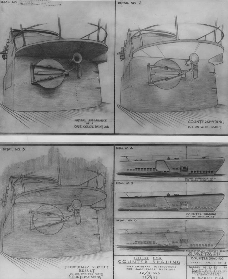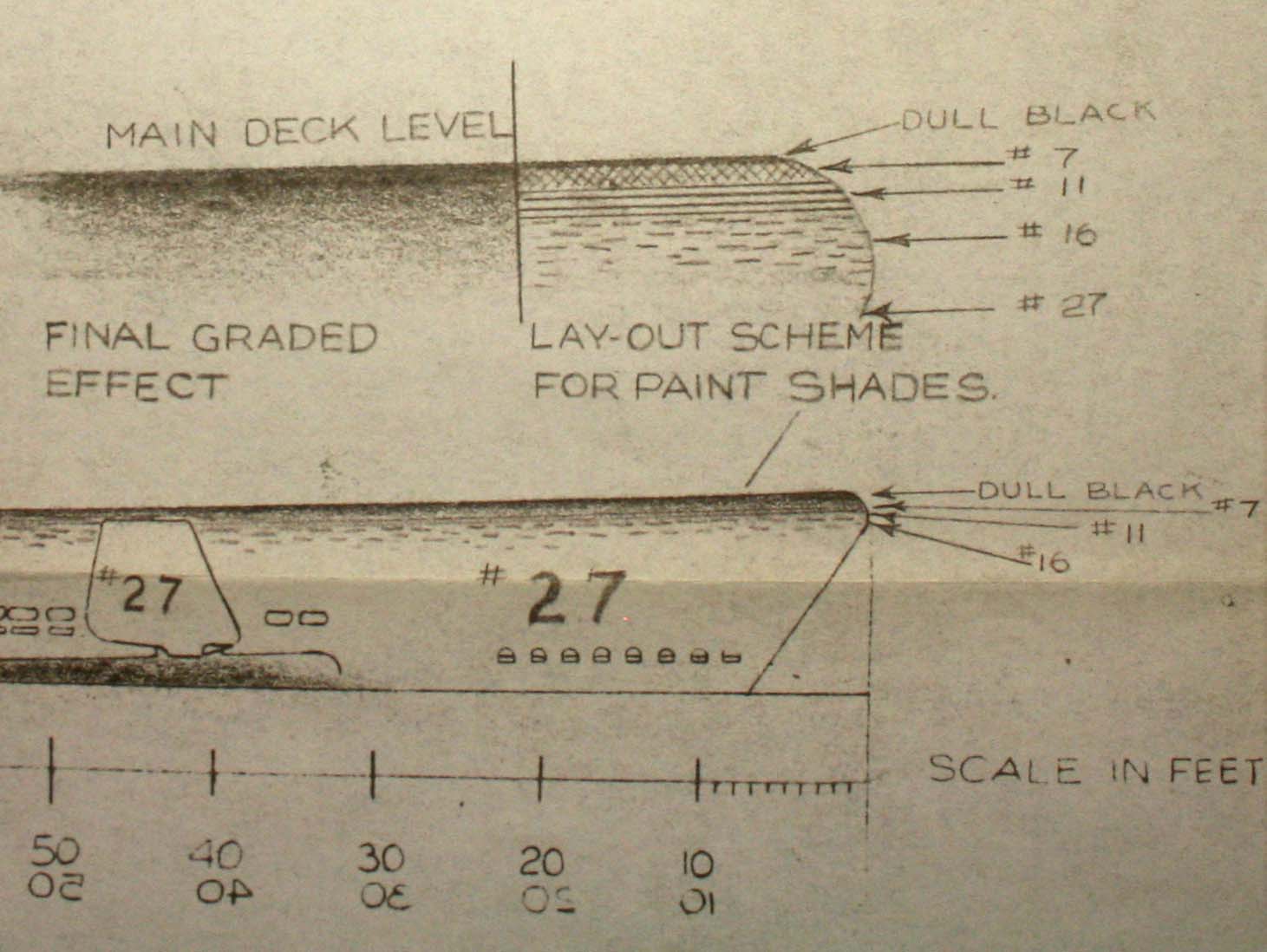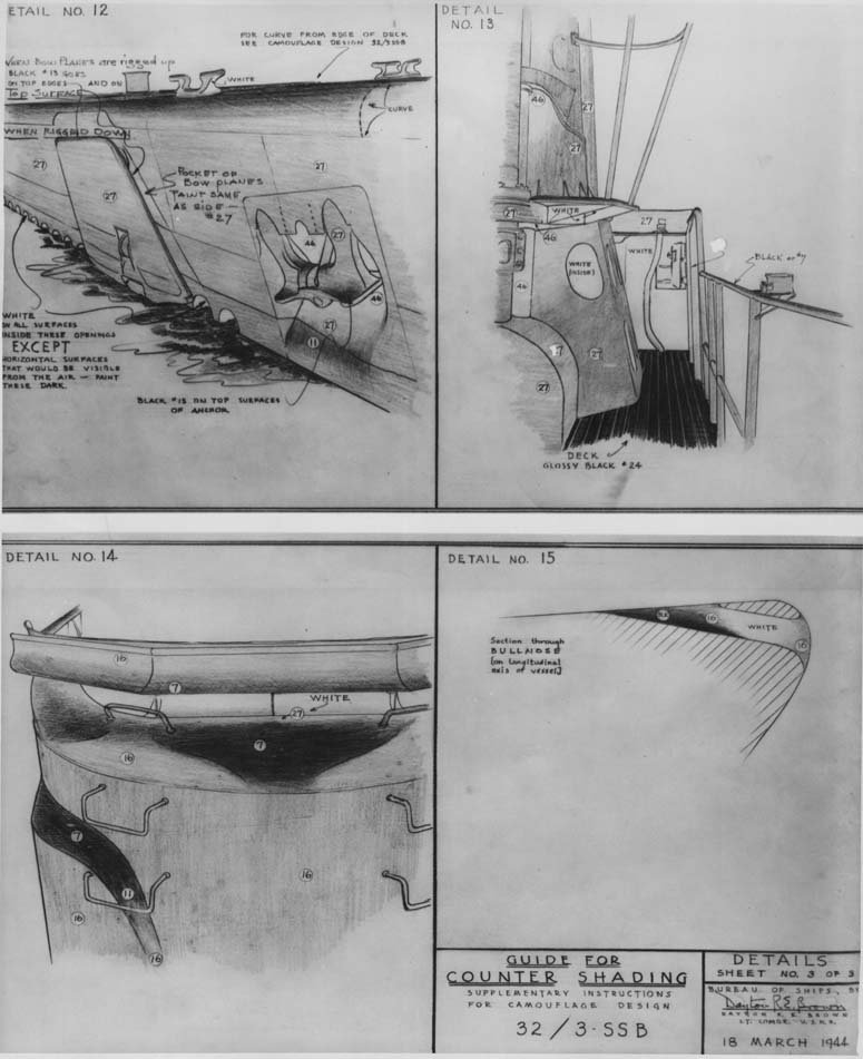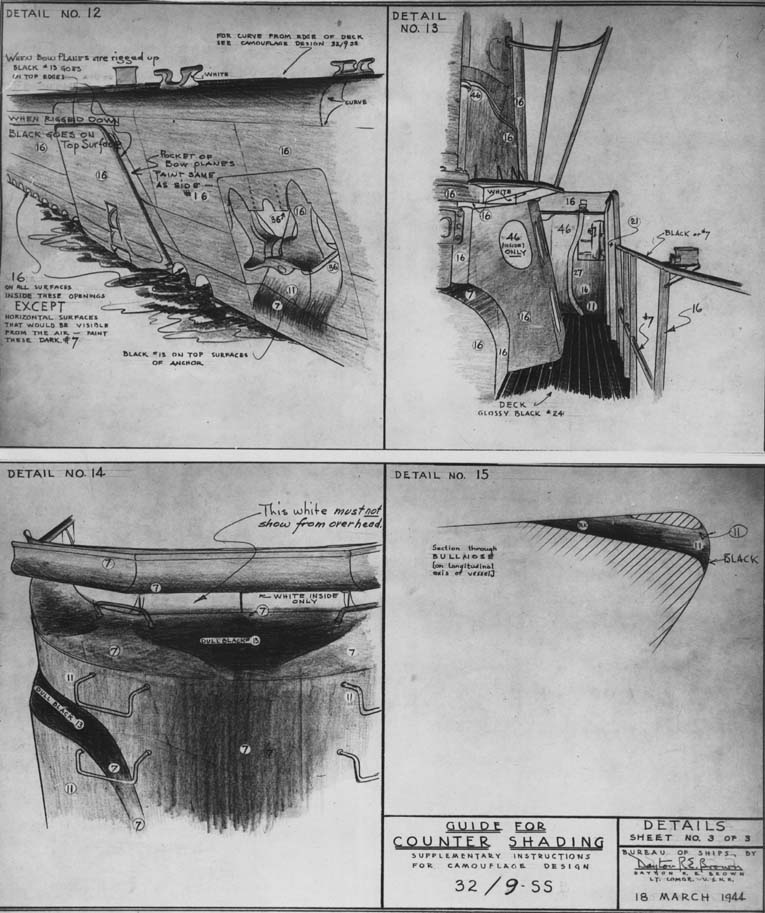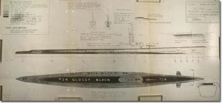 CONFIDENTIAL days, the glossy black approaches an eggshell finish which is near the ideal for low visibility. In case submarines are painted with less than 12 days before they are to arrive in their operating area, #24 Glossy Black should be cut with an equal part of Dull Black #13 or #82-Y. The "Dark Gray", design 32/9ss dated 18 March 1944, is less effective than the "Light Gray" for all surface work, However, it is the most difficult paint job to see at periscope depth and impossible to see in deep water below 150 feet. It has quite a bit of advantage over the plain black in other situations also and was designed especially for reconnaisance patrols in clear calm waters where enemy aircraft are the greatest danger. It is not bad for general patrol work, but the "Light Gray" is much better, especially at night. Even the so called "Light Gray" is too dark most of the time but to make it lighter would unduly increase its possibility of detection by enemy aircraft in the few situations that are bad. In applying the Submarine Concealment Camouflage painting there are a few things which seem to give every one a little trouble at first, even after paint samples and paint in mixed form are at hand, spray equipment is hooked up and the vessel is prepared for painting with its primer coat on. Dry and wet paint samples have been prepared by Navy Yard, P.H., and Sub Base, P.H. Six sets of dry samples have been prepared by the SPERRY. One set should be turned over to the Squadron Engineer and one to each Division Engineer aboard the SPERRY and BUSHNELL. Since all samples fade or darken in time, they should be replaced about once every five or six months, from Navy Yard, P.H., paint shop #71. Wet samples are being kept by the painter assigned to the Squadron Engineer on the SPERRY. A wet set should be kept by the BUSHNELL also. BuShips has been requested to make specifications for the submarine paint shades and to direct Navy Yard, Mare Island, paint factory to supply the shades in ready mixed form. Pending this arrangement, the shades will have to be mixed in the field. The tenders can do this for the divisions. The tenders have also been requested to assist in checking up on paint supplies, brushes, spray guns, etc., and to provide the division relief crews with all assistance possible on these material matters. Difficulties of obtaining any paint at all have been experienced in many Pacific areas, including Navy Yard, P.H., and Sub Base, P.H. It is recommended that a careful check be kept of paint stocks and 3 to 4 months allowed for filling new orders.